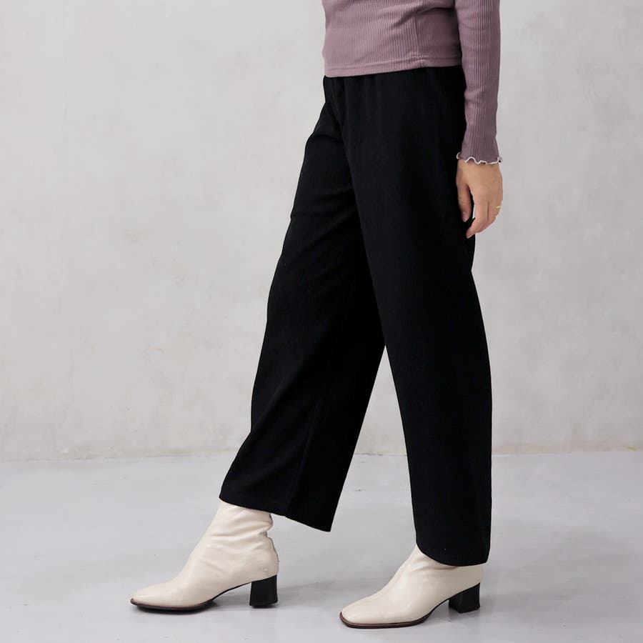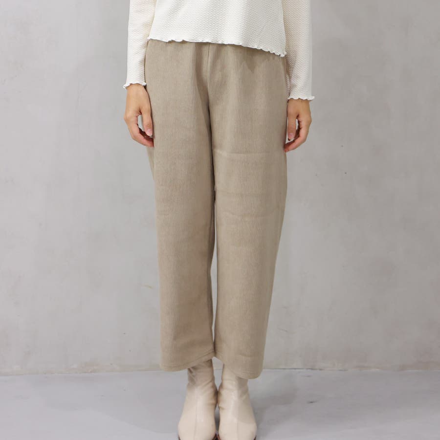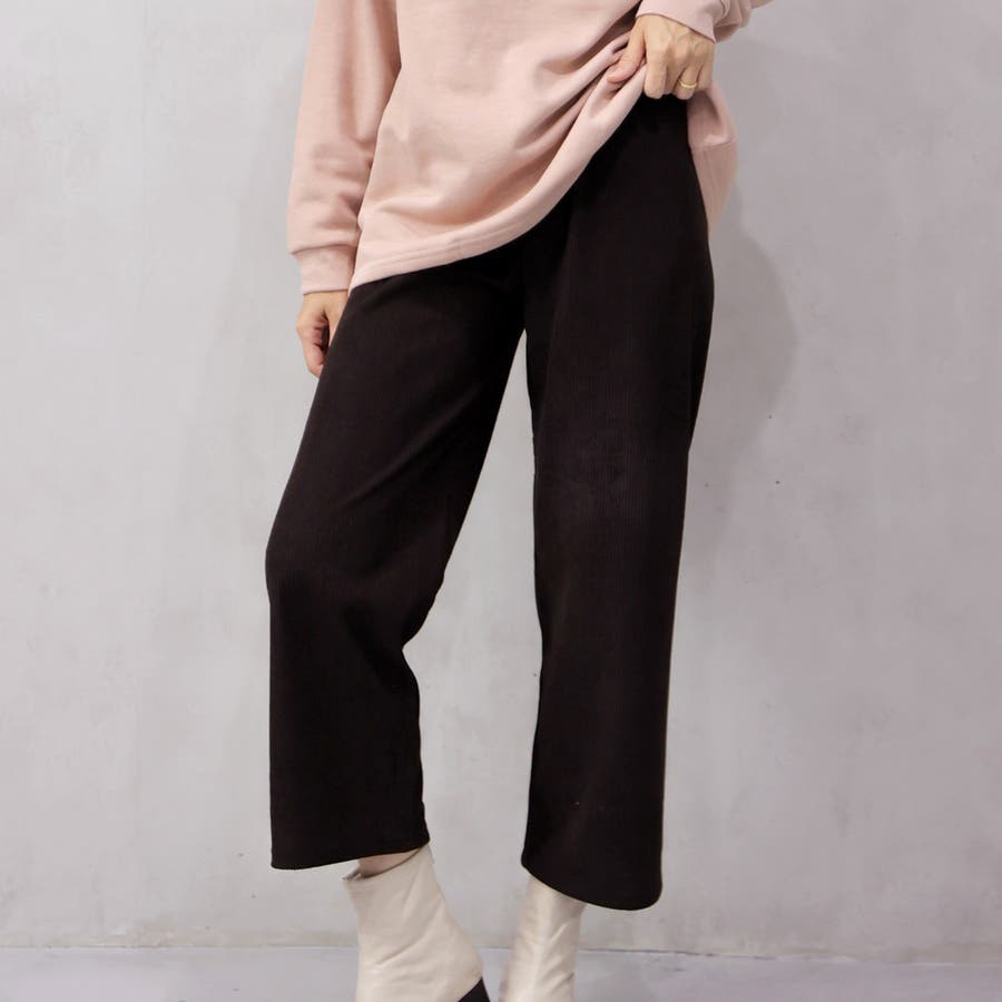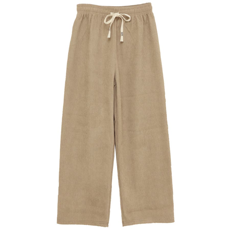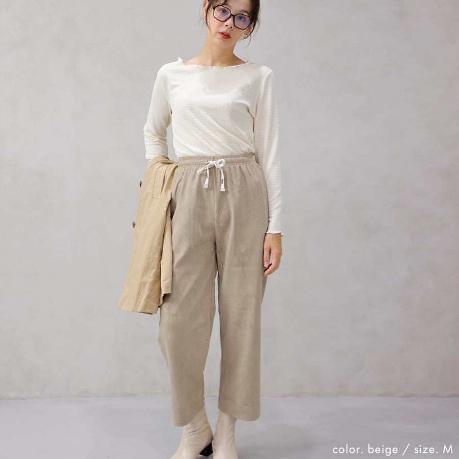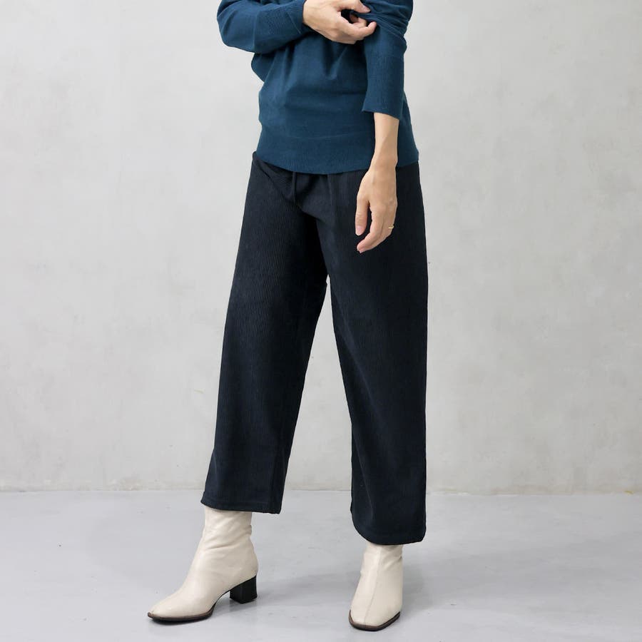 幅広いコーディネートに着回しのきく、ワイドコールのゆるパンツ。