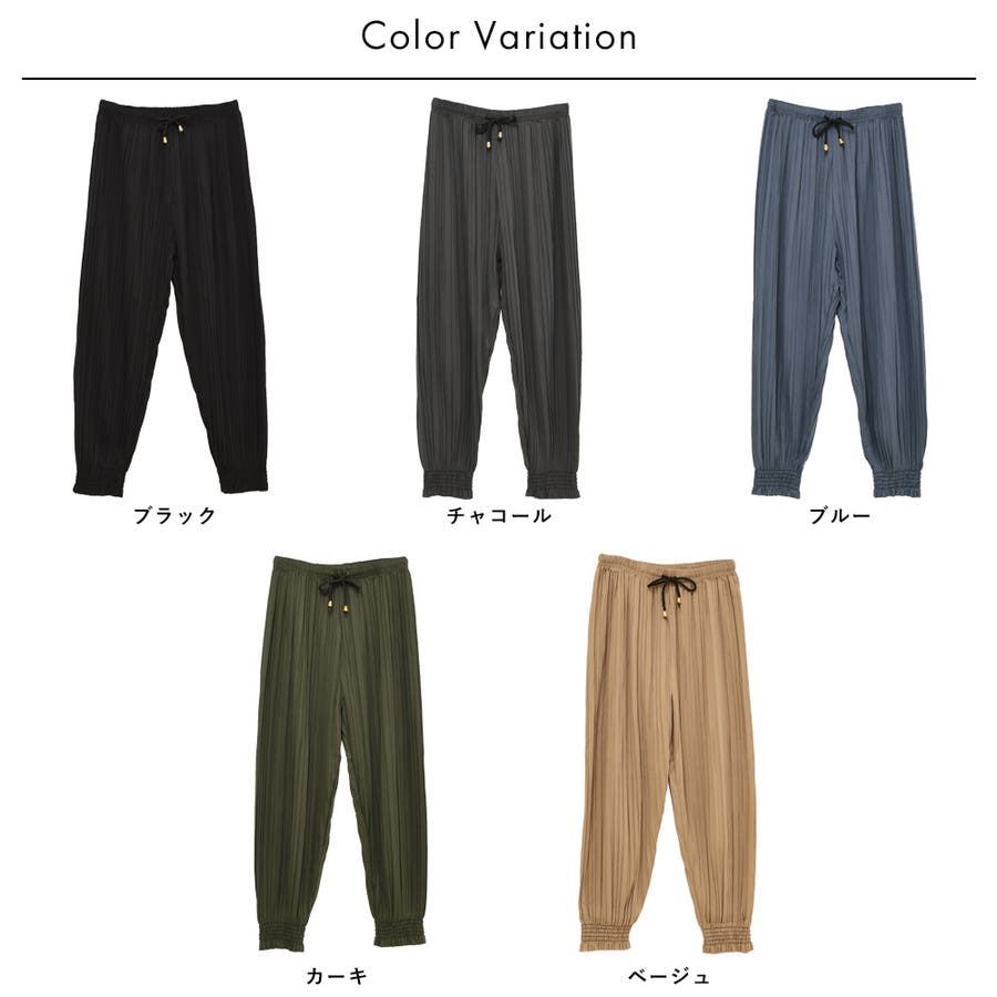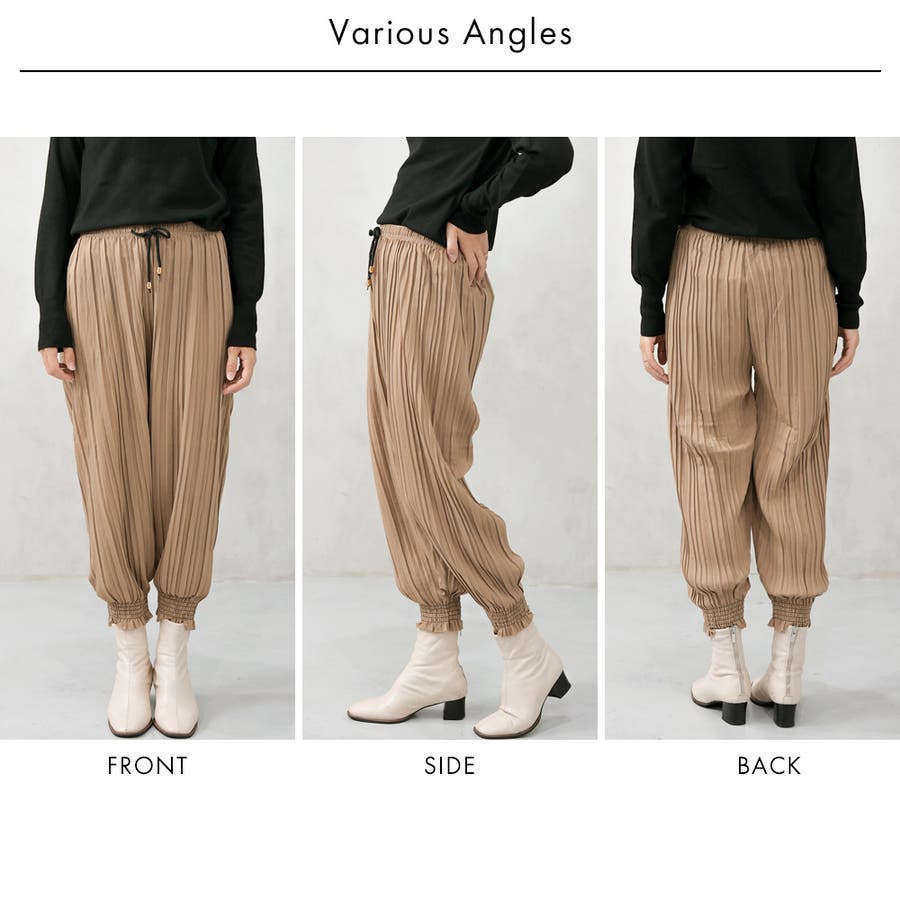 プリーツとジョガー的なラインがほんと素敵です。2色買い。カジュアルにも綺麗にとなる。表マット、裏は安っぽさあるシャイニー薄手の生地で、質的にはワンシーズンだけかもですが、マルチコーデに使えるとても素敵なアイテム。あー、追加欲しいかも。