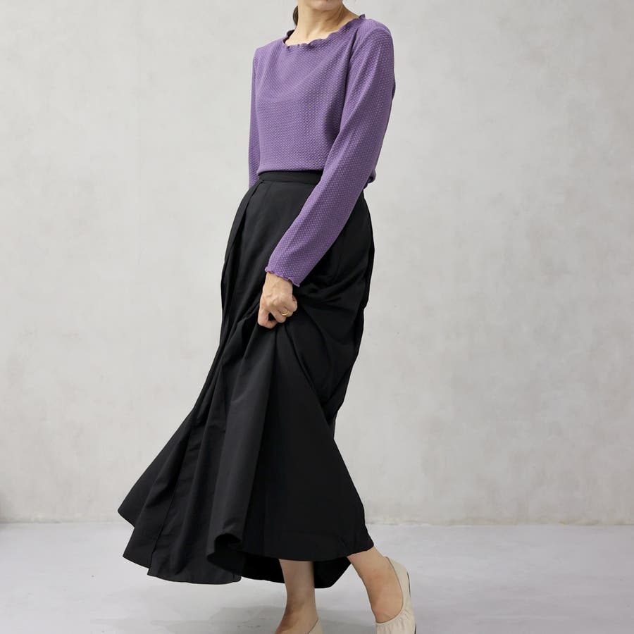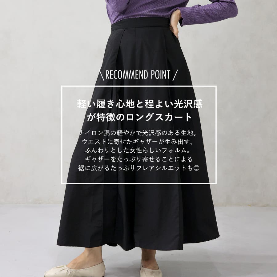 とても軽い履き心地と程よい光沢感が特徴のギャザーロングスカート。