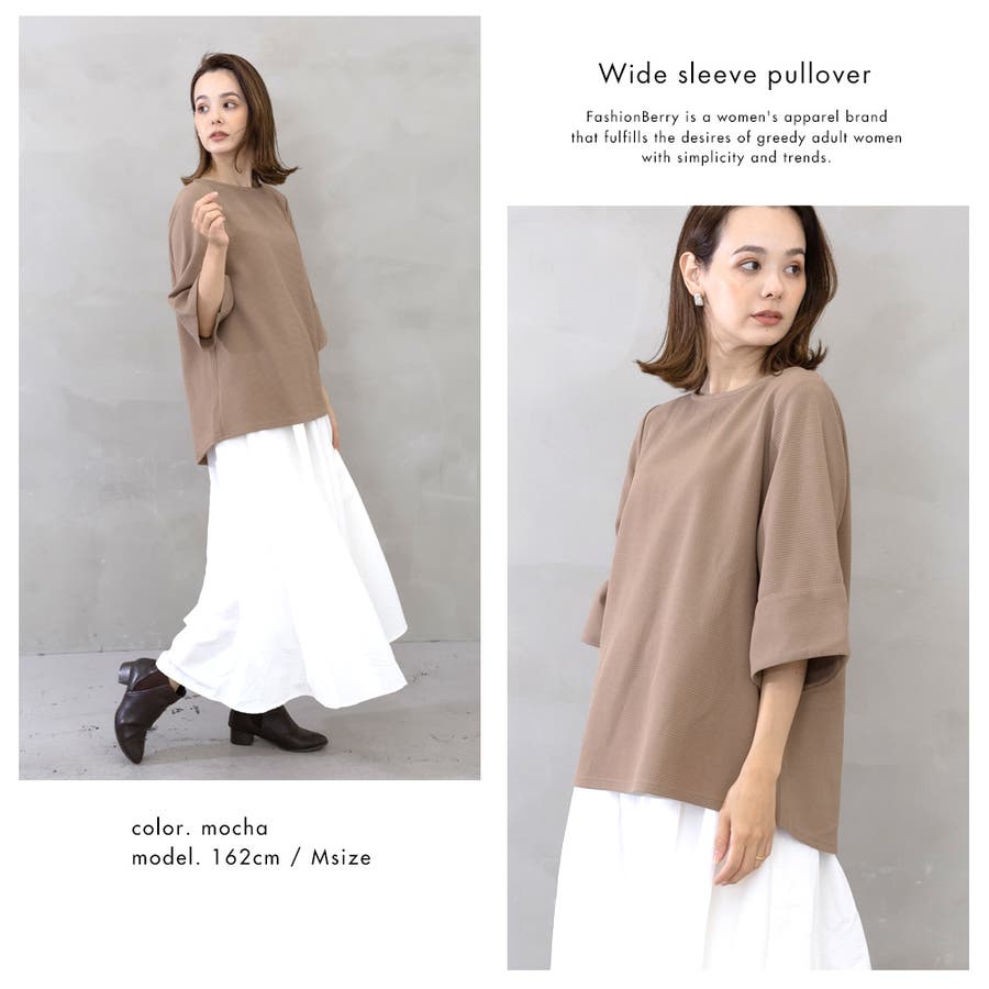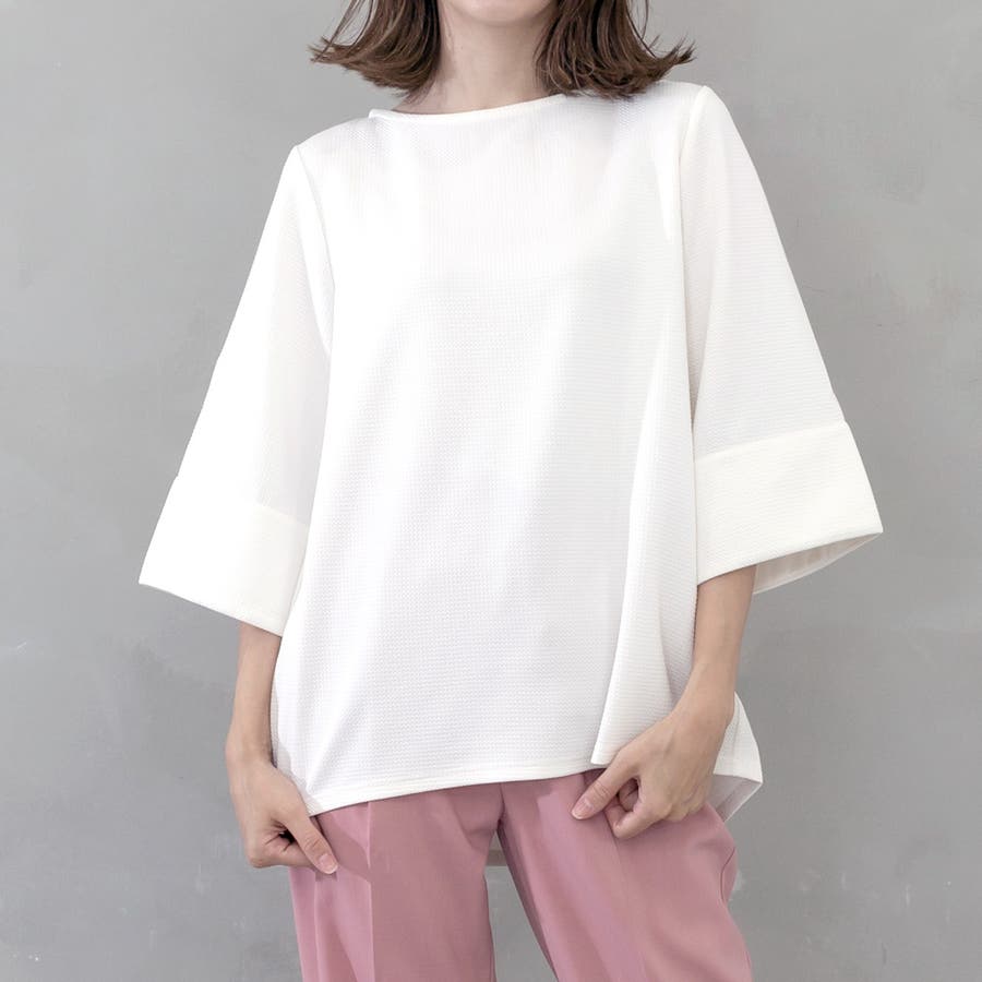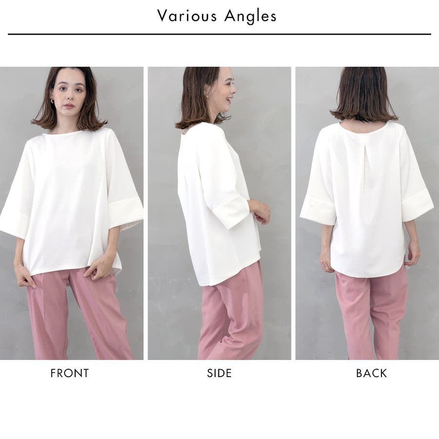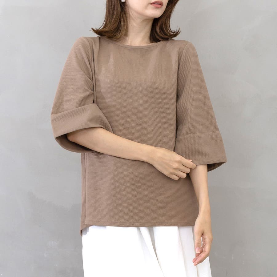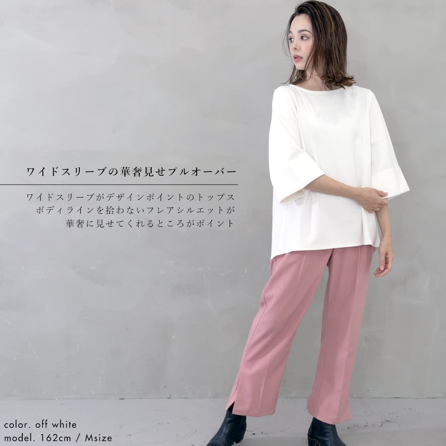 デコルテが美しく見えるネックラインとワイドスリーブが女性らしく、ボディラインを拾わないシルエットが華奢に見せてくれるところもポイント。