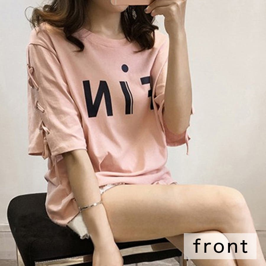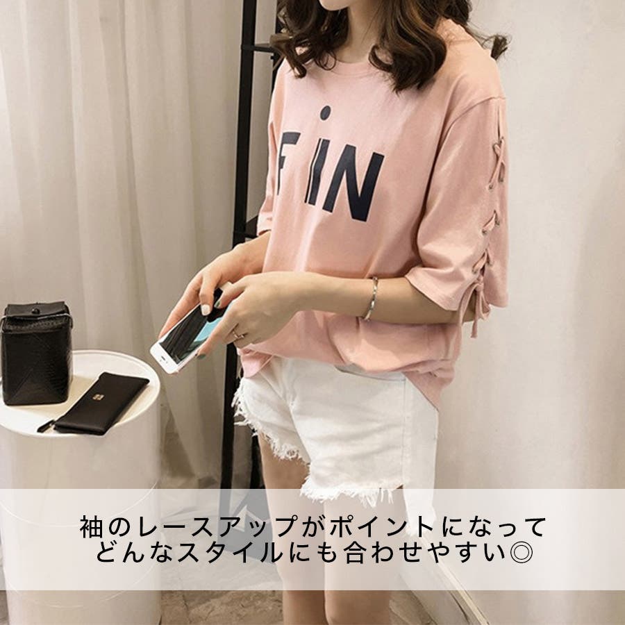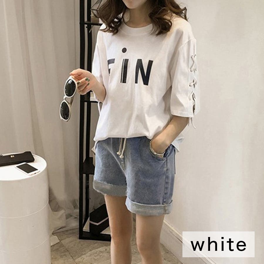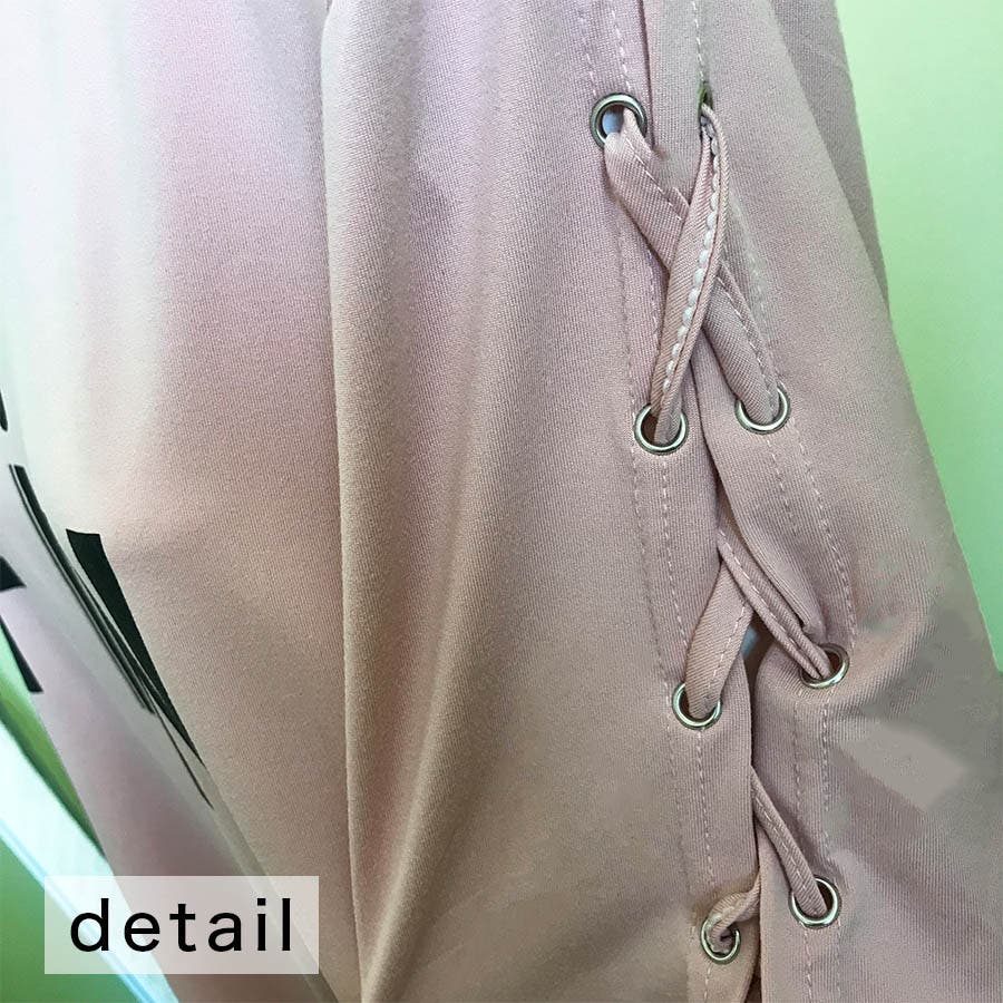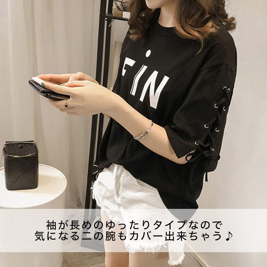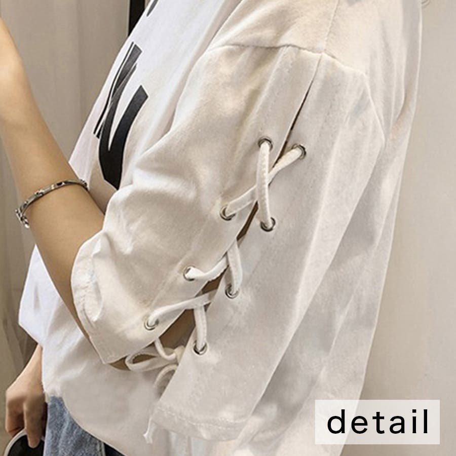 ゆったりとしたトレンドのビッグシルエットなのでタイトなボトムに合わせるだけでオシャレに決まります。レースアップデザインがさりげなく周りと差をつけられるオシャレなポイントです。テロンとした肌触りの良い生地は動きやすくシワになりにくいのが嬉しいポイント!ホワイトは透けるのでインナーの着用が必要です。