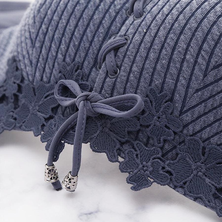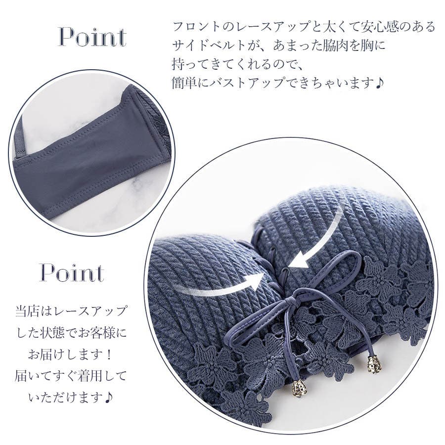 ワッフル素材のようなフワフワな生地とお花のレースデザインがとってもカワイイです。パッド&中央のリボンで簡単に谷間がつくれちゃいます。アンダーは伸縮性&3段階ホックで自分にピッタリのサイズにできて良かったです。