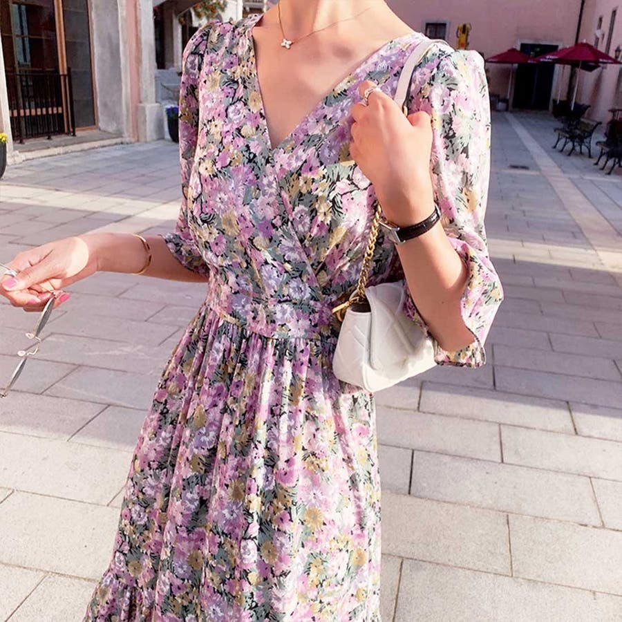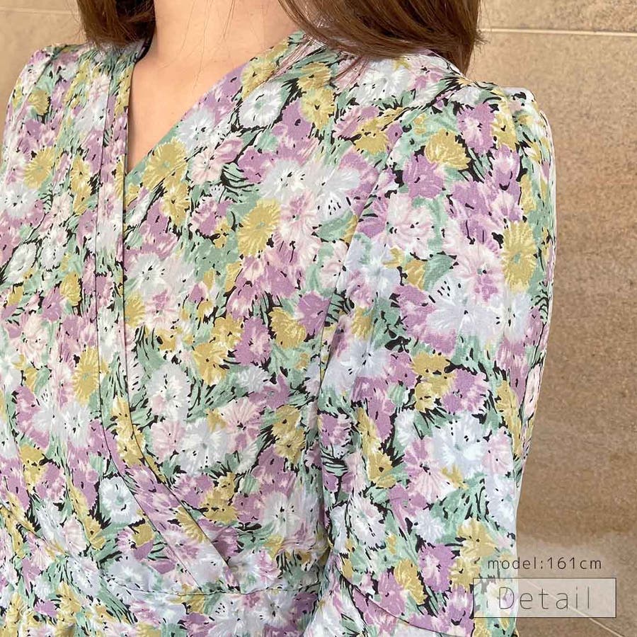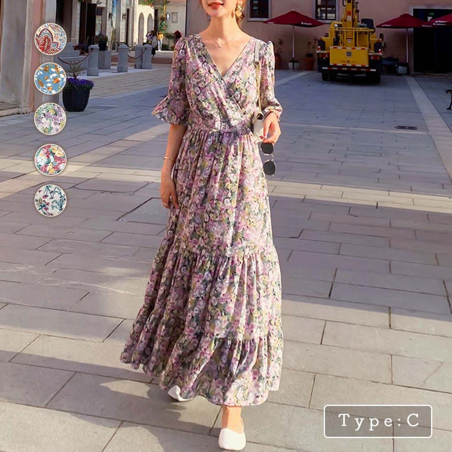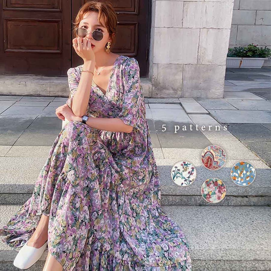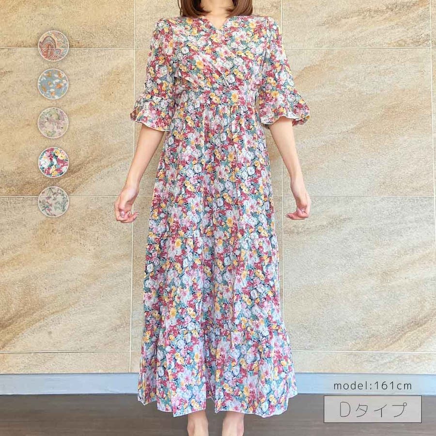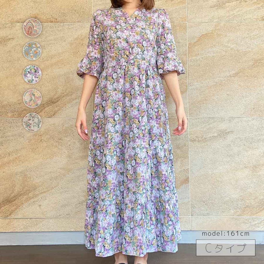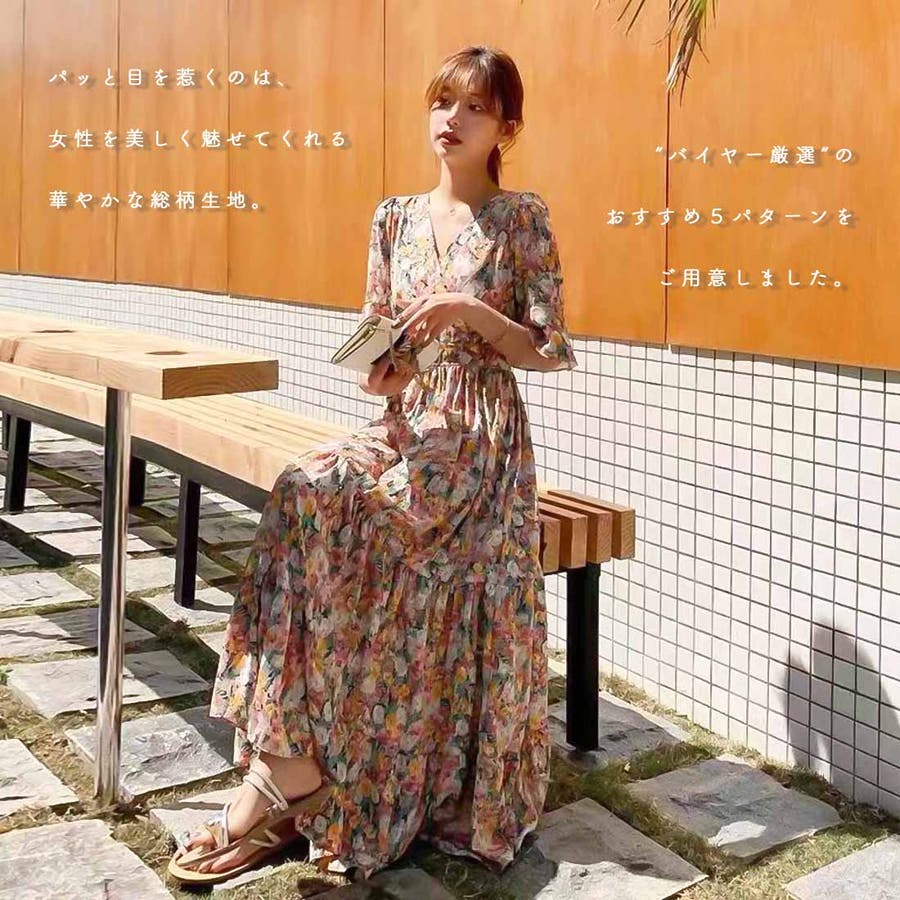 総柄が目を惹くロングワンピースが新登場♪花柄・草花柄・ペイズリー柄など、バイヤーレコメンドのパターンのみをご用意しました。襟元のカシュクールが大人らしさを、スカート部分のティアードが甘さをプラスします。ウエストマーク+Aラインシルエットだから、スタイルアップ効果も◎デートシーンにもおすすめしたいアイテムです。