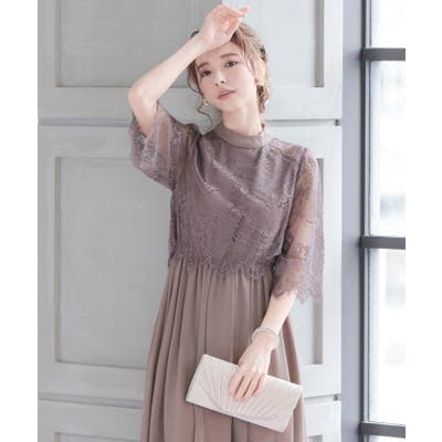 ケープ風に見えるレーストップスが可愛らしいミディ丈のパーティードレス。