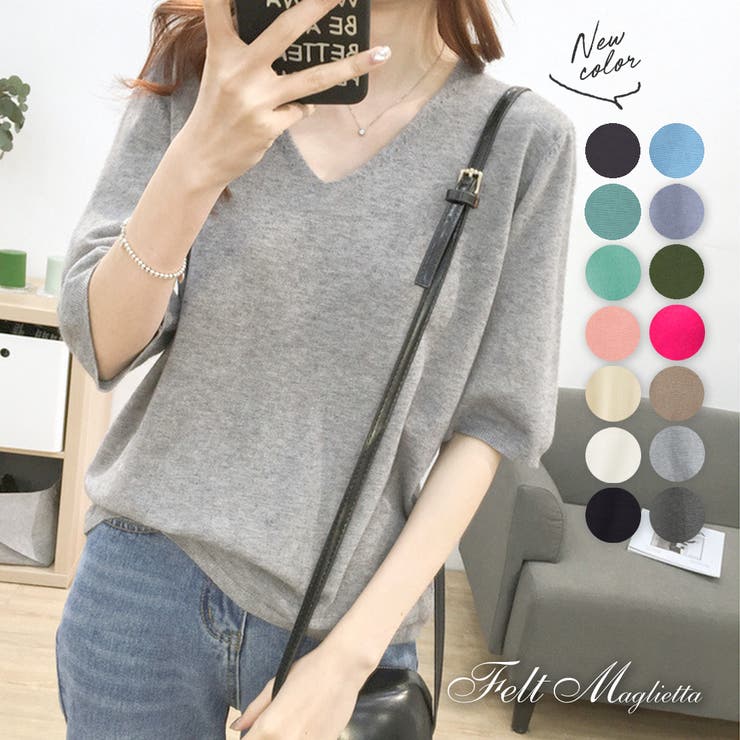 レーヨン混で柔らかいタッチのニットで、デコルテをスッキリ見せられるVネック。