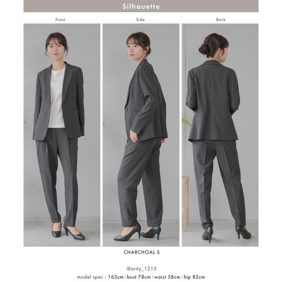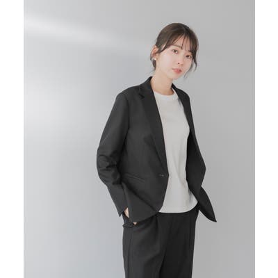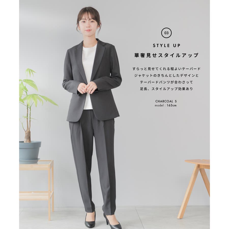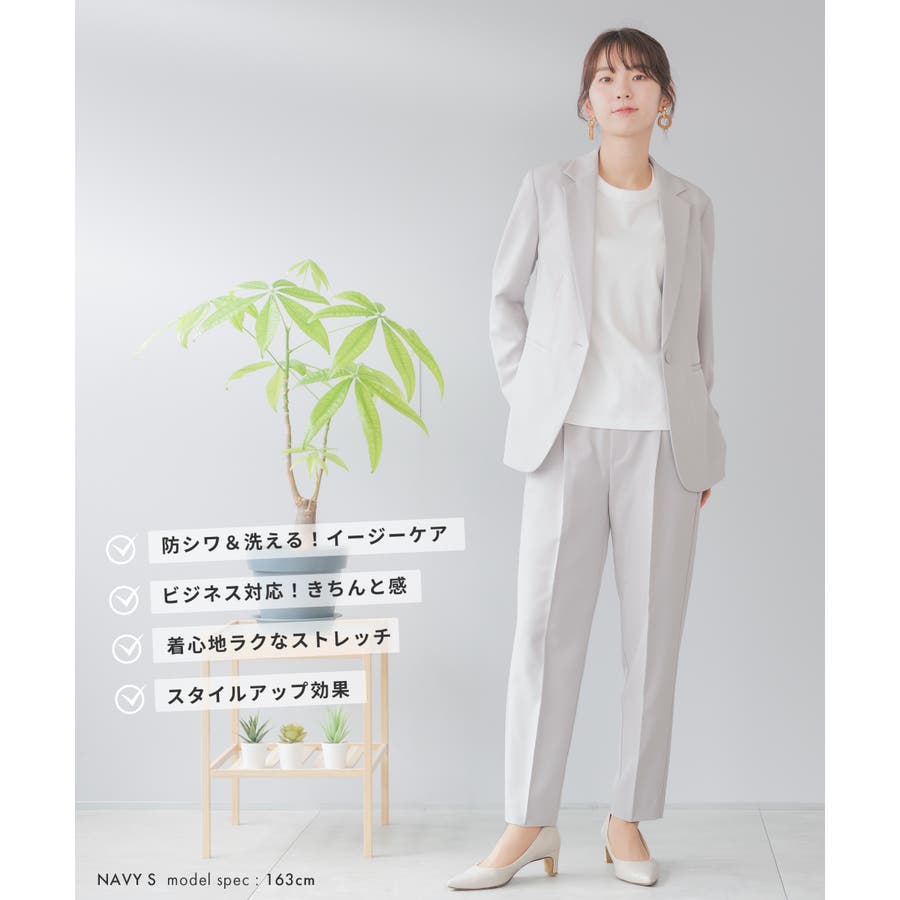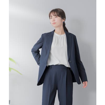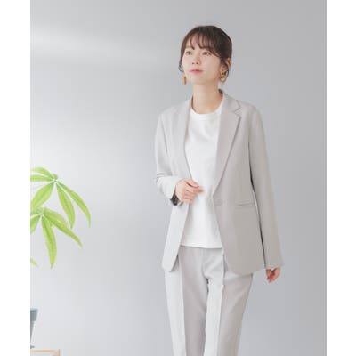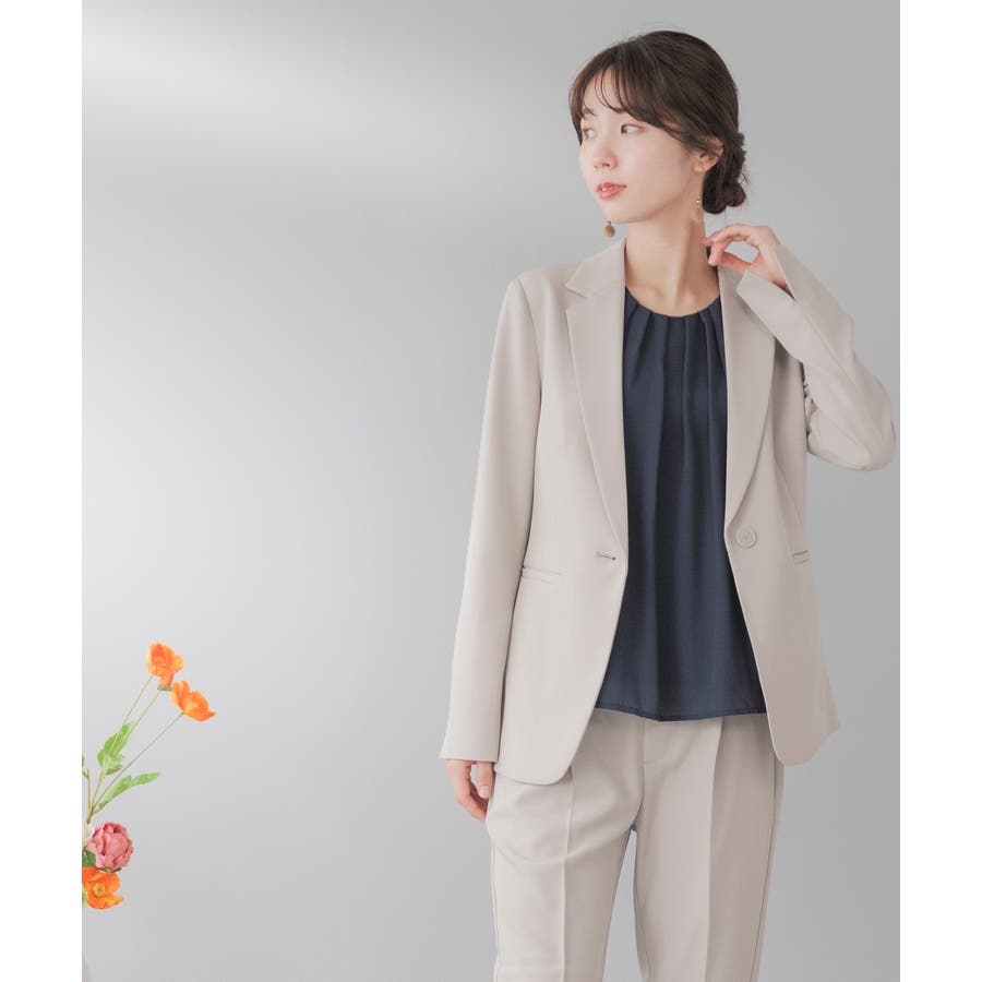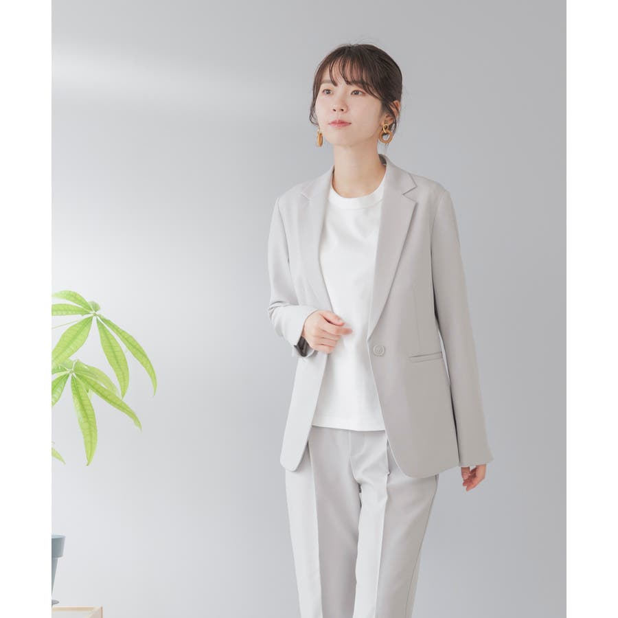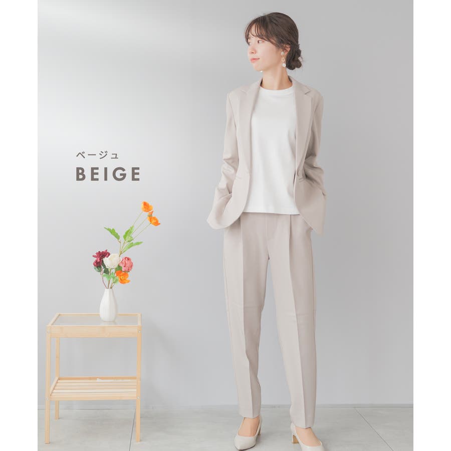 テーラードジャケットのすっきりしたデザインとテーパードパンツが合わさって