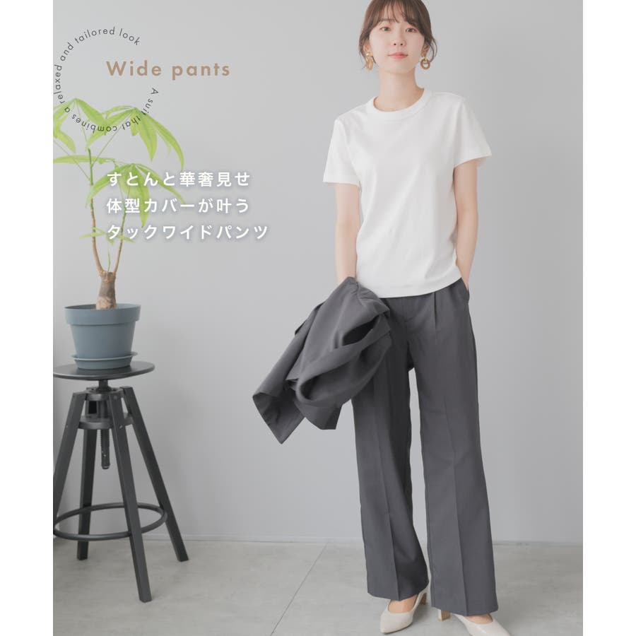 ストンと華奢見せ、体型カバーが叶うタックワイドパンツ。