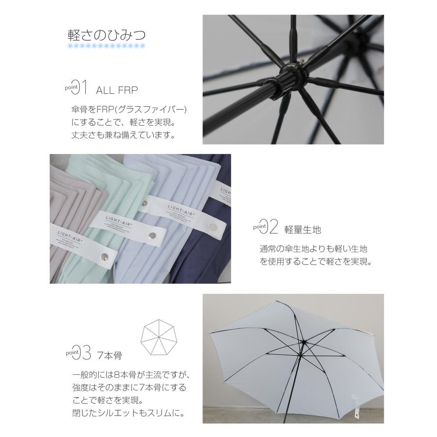 特徴 | LIGHT AIR 超軽量・超撥水 パステルカラーがおしゃれな長傘。どんなコーデにもマッチします。 【超軽量】 重さ約250g。 軽くて持ち運びに便利。長時間さしても疲れ知らず。 ◆軽さのひみつ◆ 傘骨をFRP(グラスファイバー)にすることで、軽さを実現。丈夫さも兼ね備えています。 通常の傘生地よりも軽い生地を使用することで軽さを実現。 一般的には8本骨が主流ですが、強度はそのままに7本骨にすることで軽さを実現。閉じたシルエットもスリムに。 【超撥水】 撥水効果の高い高密度ポロエステル生地を使用し、表面に超撥水加工を施しているため、抜群に水はじきが良く速乾性に優れています。 【晴雨兼用】 紫外線防止効果があるので、雨の日だけでなく日傘としても使用できます。 カラーによって紫外線遮へい率が異なります。 淡色:約75% / 濃色:約90% 【耐風仕様】 傘骨には丈夫でしなやかな素材グラスファイバーを使用。 強い風でも壊れにくく、ひっくり返っても簡単に戻る仕様になっています。 【セーフガード機能】 傘の開閉時に指を挟んだり爪を痛めたりしないように、ストッパー部分にはセーフガード機能付き。 【大きめサイズ】 親骨60cmの大きめサイズ。 雨からも日差しからもすっぽりと包み込んで守ってくれます。 |