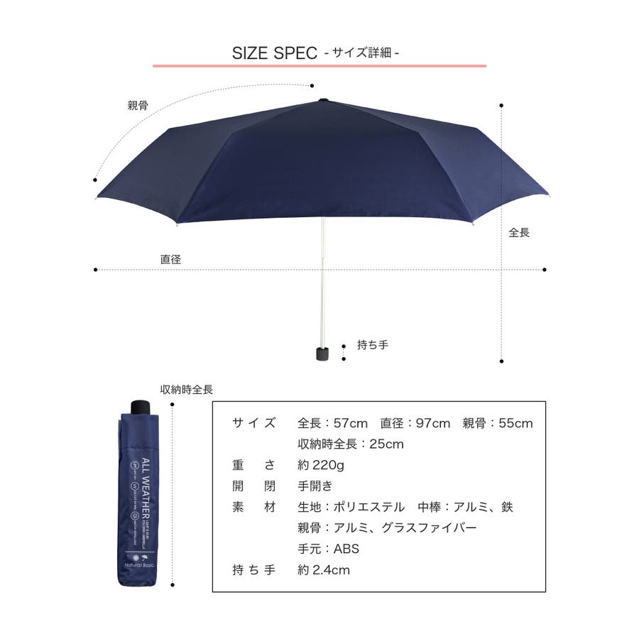 | サイズ | 重さ:220g 直径:97cm 親骨:55cm 収納時全長:25cm |