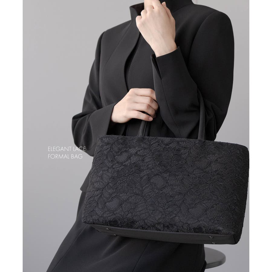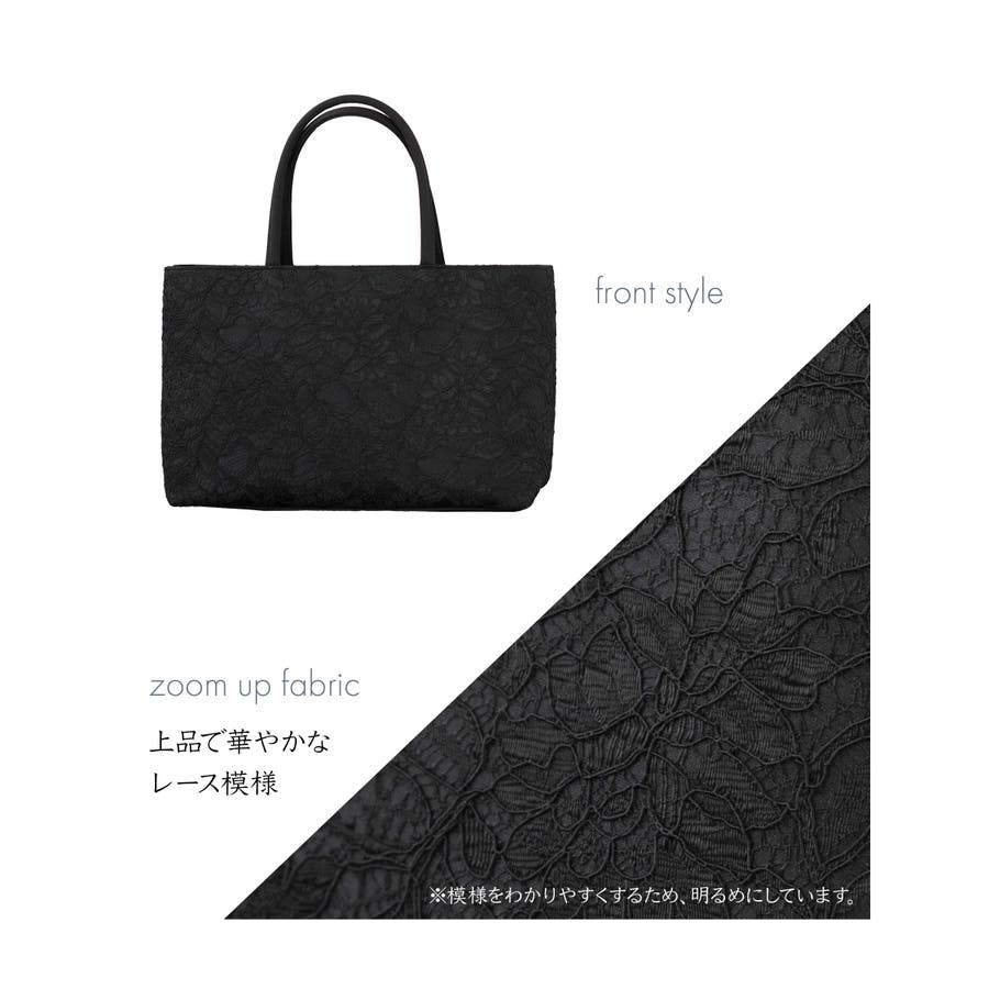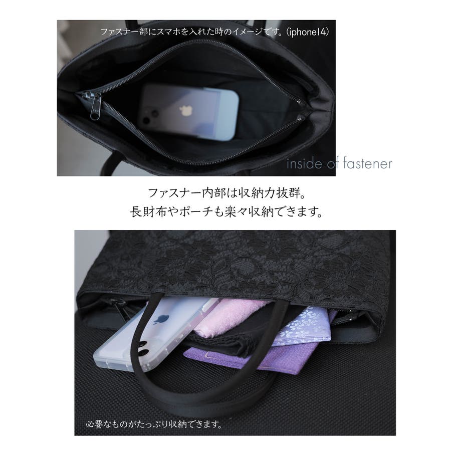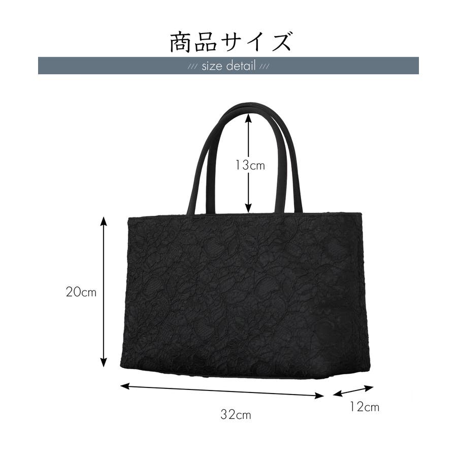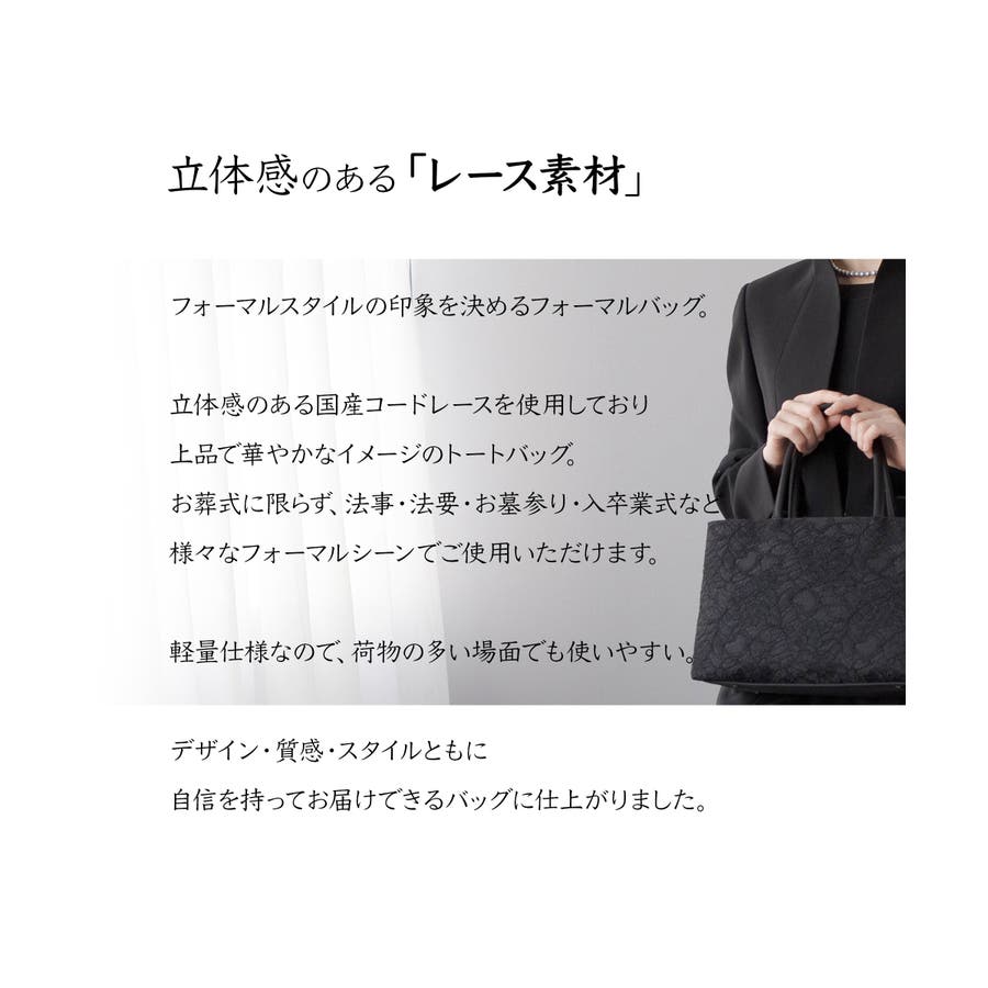 特徴 | 大きめサイズのレース模様フォーマルトートバッグ 立体的なコードレース模様が上品なバッグ。 お葬式に限らず、法事・法要・お墓参り・入学式・卒業式など様々なフォーマルシーンでご使用いただけます。 ふくさ・念珠・ハンカチ・スマートフォン・財布・リップ・ハンドクリームなど、必要なものを入れても余裕のあるサイズ感。 貴重品をファスナー部分へ、袱紗やお念珠、ハンカチ、スマホなどすぐに取り出したいものは側面へいれておくことで、スマートな振る舞いが可能です。 バッグの底には自立する底鋲付き。 両側・中央ファスナーの3分割収納タイプ。 バッグの内側には小さなポケットを配置していますので、 ミニ鏡などを入れることが可能です。 軽量仕様なので、荷物の多い場面でも使いやすい。 持ち手の高さ:13cm (外寸)幅:32cm / 奥行:12cm / 高さ:20cm 生産国:日本 |