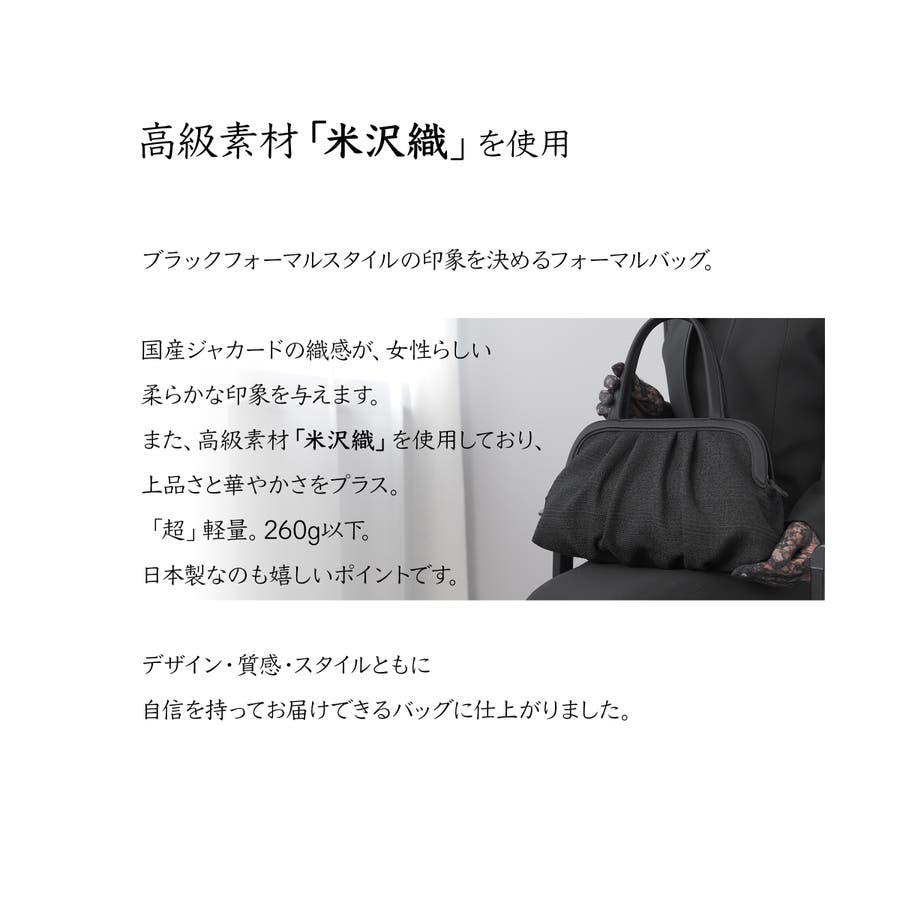 素材 | 高級素材『米沢織』使用フォーマルバッグ、 国産ジャガードの織感とふっくらとしたフォルムが女性らしい柔らかな印象のソフトバッグ。 |