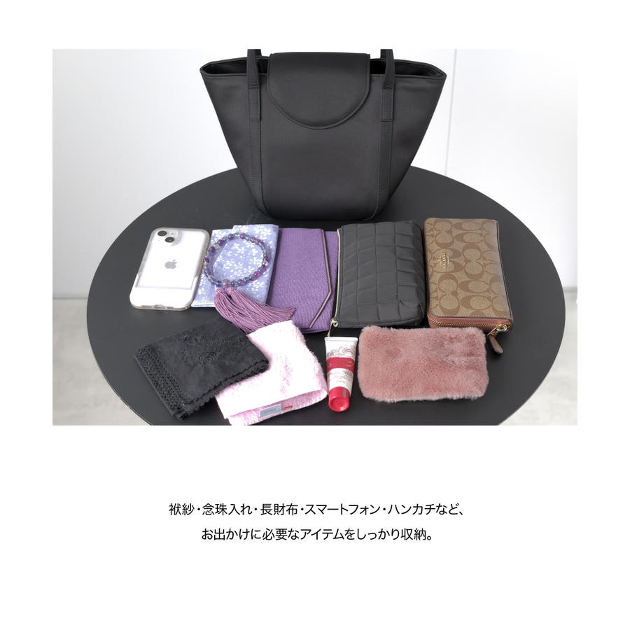 長財布やスマホ、袱紗、ハンカチなど必要なアイテムがしっかり入る実用的なサイズ感。
