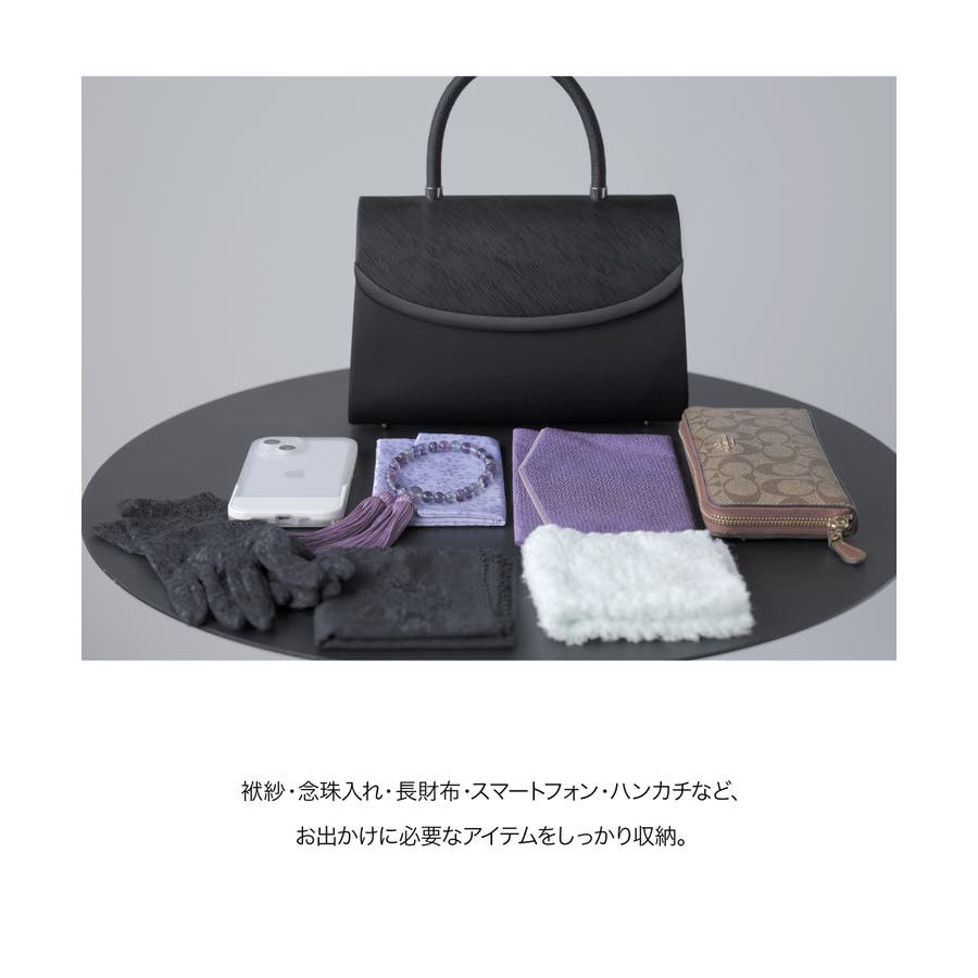 大きめサイズで、スマートフォン・袱紗・ハンカチ・念珠入れ・長財布など必要なものがしっかり入るサイズ感。