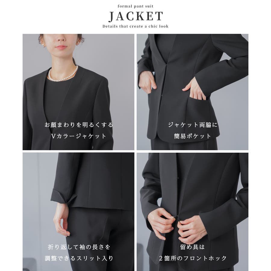 顔周りをスッキリ見せるVカラーとストンと落ちるレギュラーシルエットの3pcsブラックフォーマル