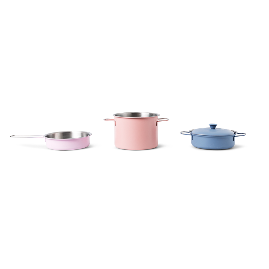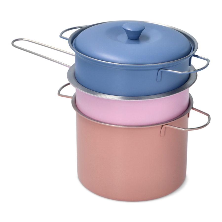 おもちゃの鍋セット。フタ付きパン、フライパン、深型鍋のセットです。ステンレススチール製です。マットな仕上がりで、本格的なおままごとができます。推奨年齢2才以上です。深型鍋のサイズ:10×10×6.5 cm。