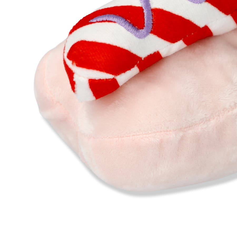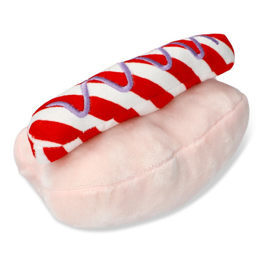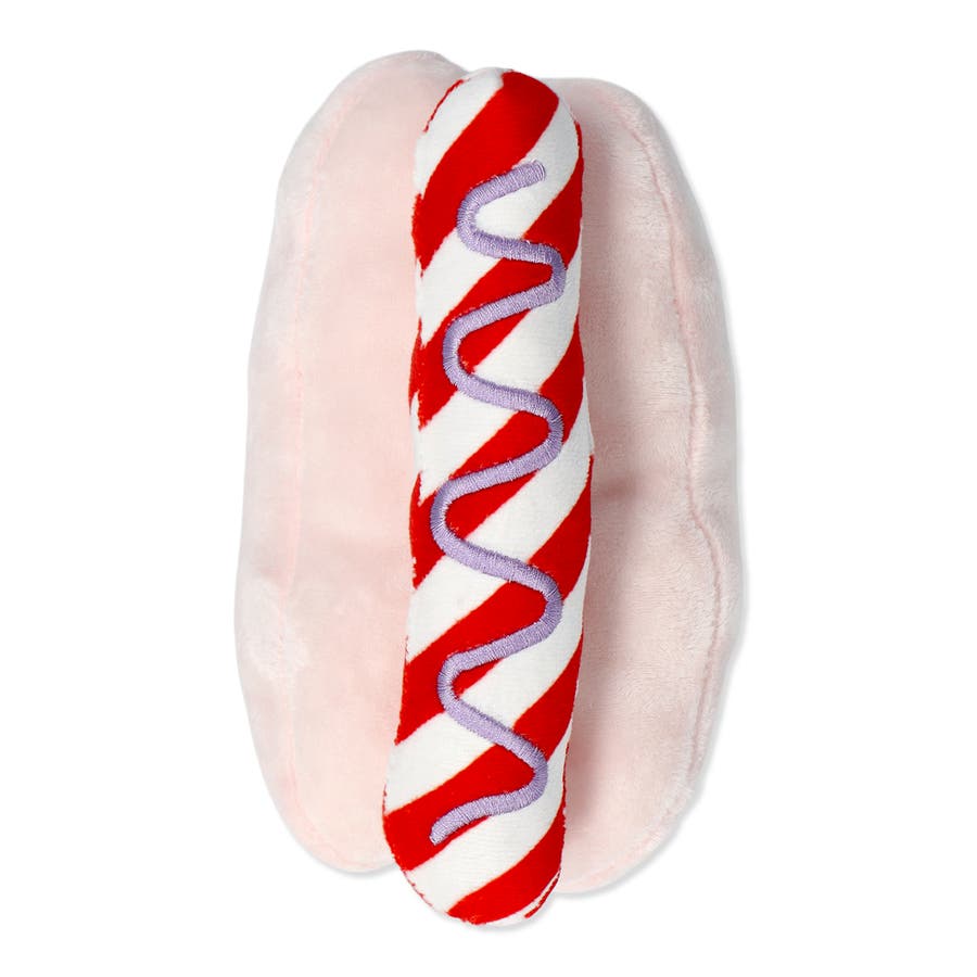 ペット用のおもちゃ。ユニークなピンクのホットドッグです。素材はポリエステルです。