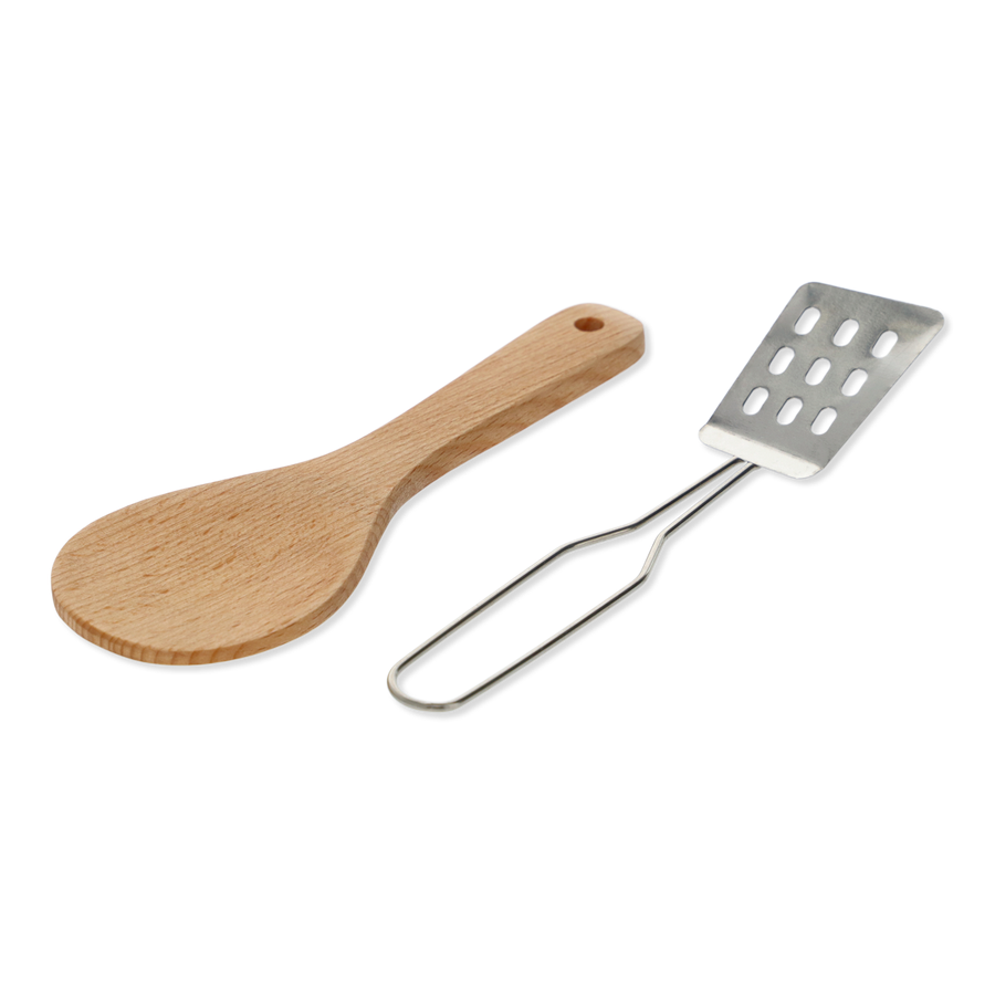 おもちゃのキッチンツールセット。泡立て器、ヘラ、フライ返し、穴あきレードルの4種類セットです。おままごとに本格的なツールを取り入れましょう。推奨年齢2才以上です。FSC認証。泡立て器のサイズ:16×5×2 cm。