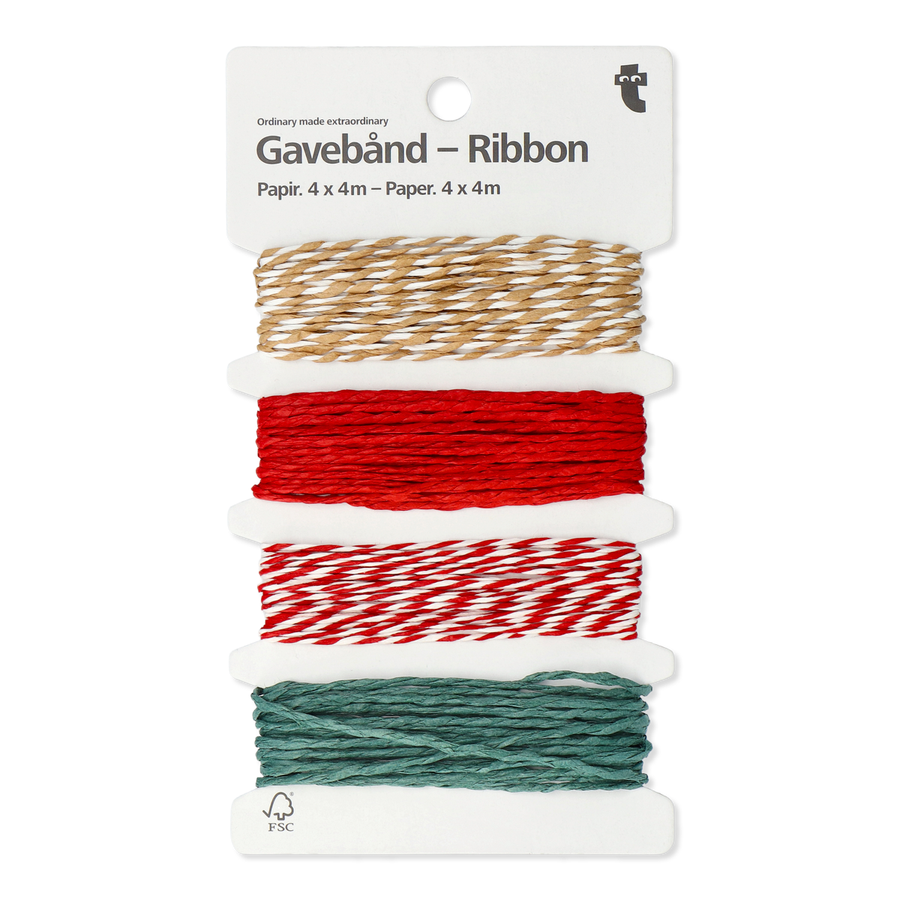 ツイストペーパーリボン4種類セット。ブラウンと白、赤、赤と白、グリーンのツイストリボンです。FSC認証。長さ:4m。