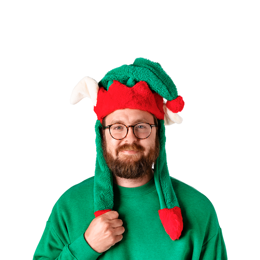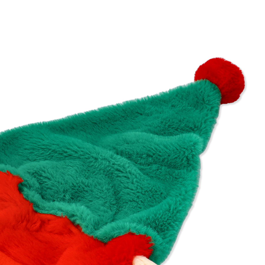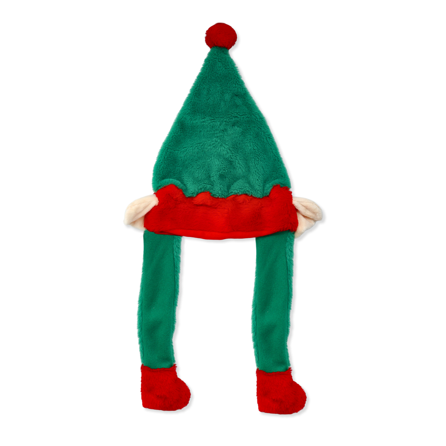 クリスマスのエルフハット。両側に垂れた赤い部分を押すと、耳がぴょこぴょこ動きます。マテリアルにリサイクル素材を使用しています。サイズ:78×39 cm。