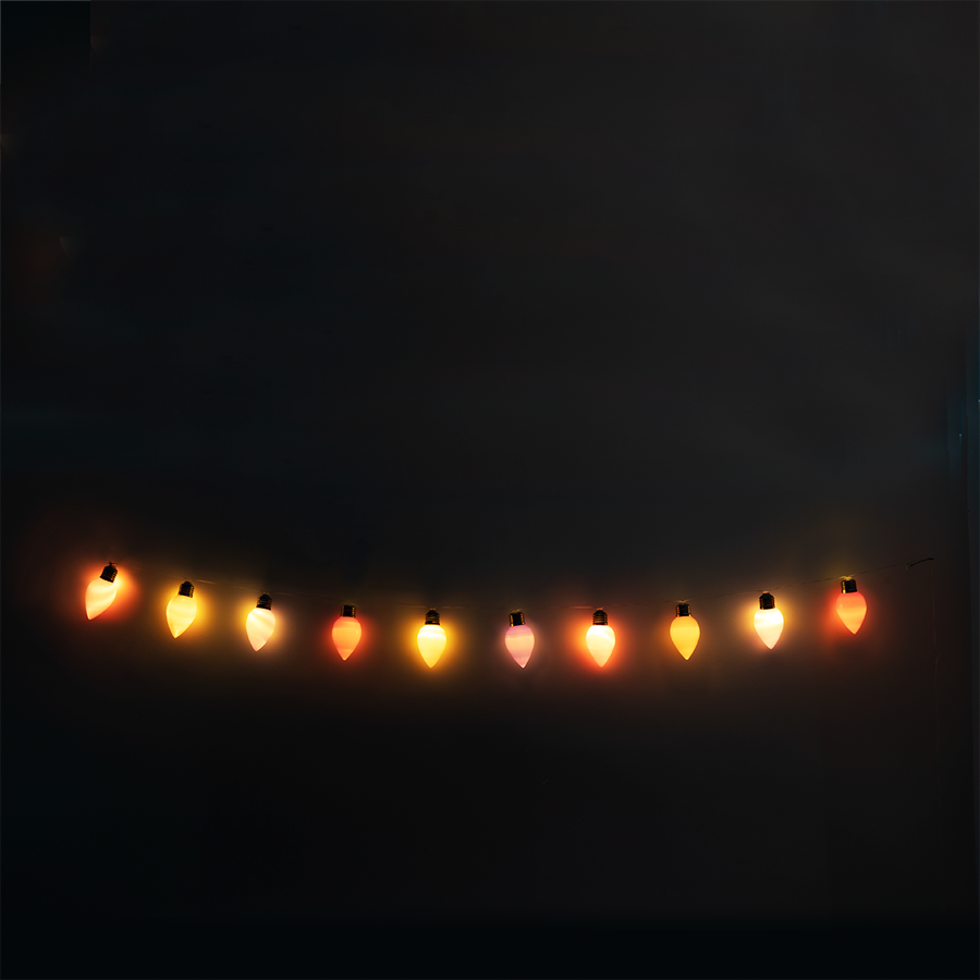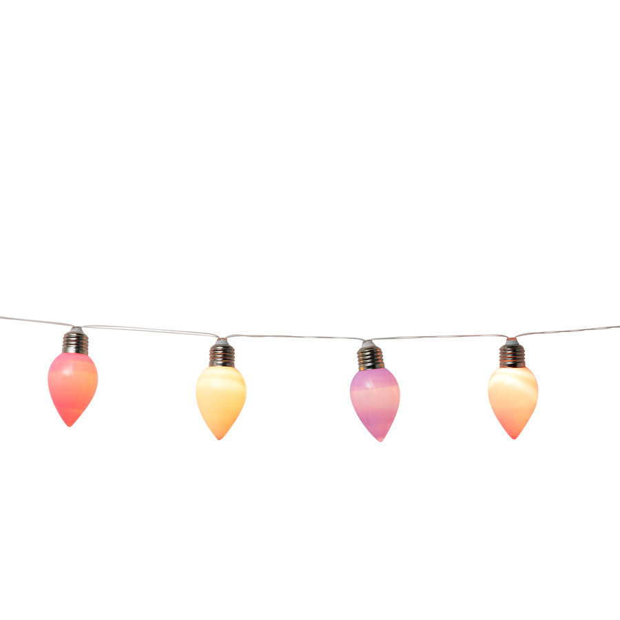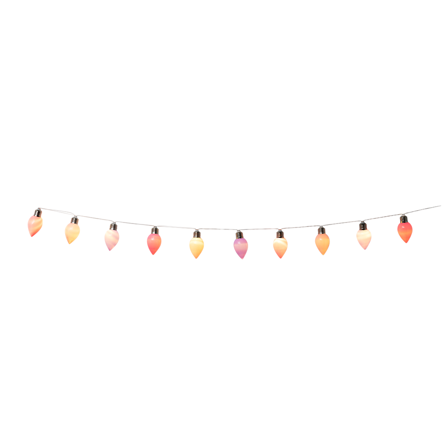 LEDライトチェーン。様々なトーンのピンクとパープルの電球が10個ついています。大きな電球なのでお部屋が華やかになります。単三電池2本使用(別売)。長さ:285 cm。