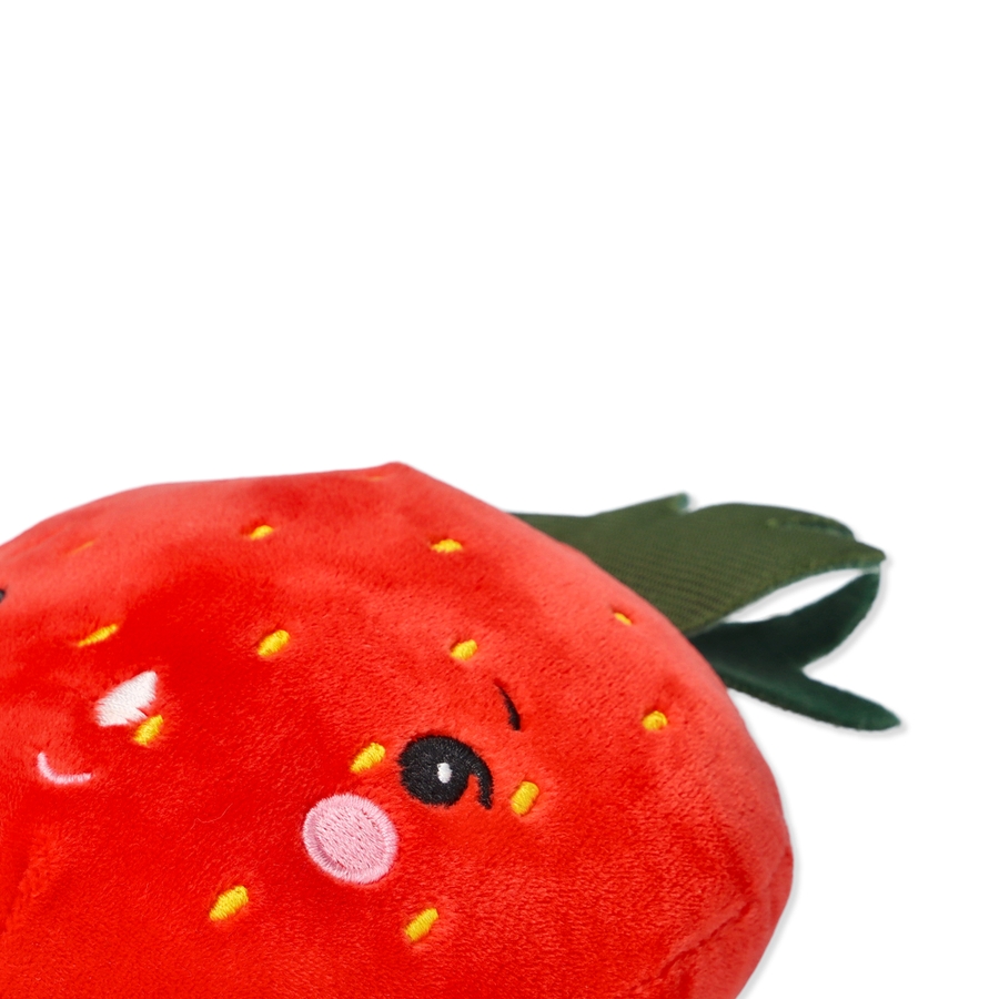 イチゴちゃんのぬいぐるみ。キュートな表情で、触り心地も滑らかです。ストラップ付きです。手洗い可能です。サイズ:11×12×7 cm。