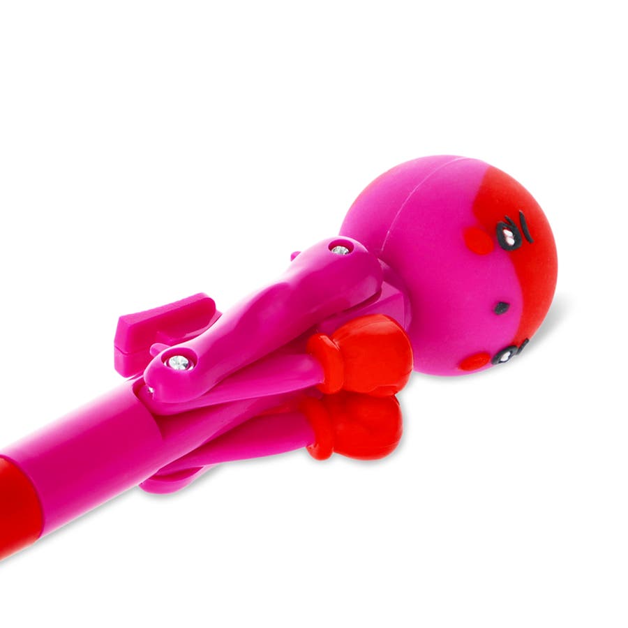 怒りんぼうのボクシングボールペン。背中のボタンを押すとワンツーパンチをくり出します。"Angry"ちゃんは誰でも時にはちょっぴり怒ることもあるよねと教えてくれます。筆記具に遊び心をプラスしましょう。対象年齢3歳以上。サイズ:18×3×3 cm。