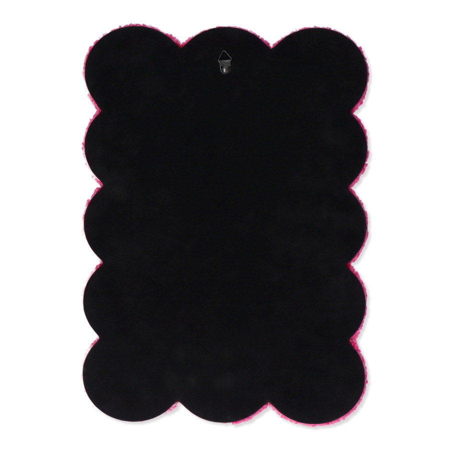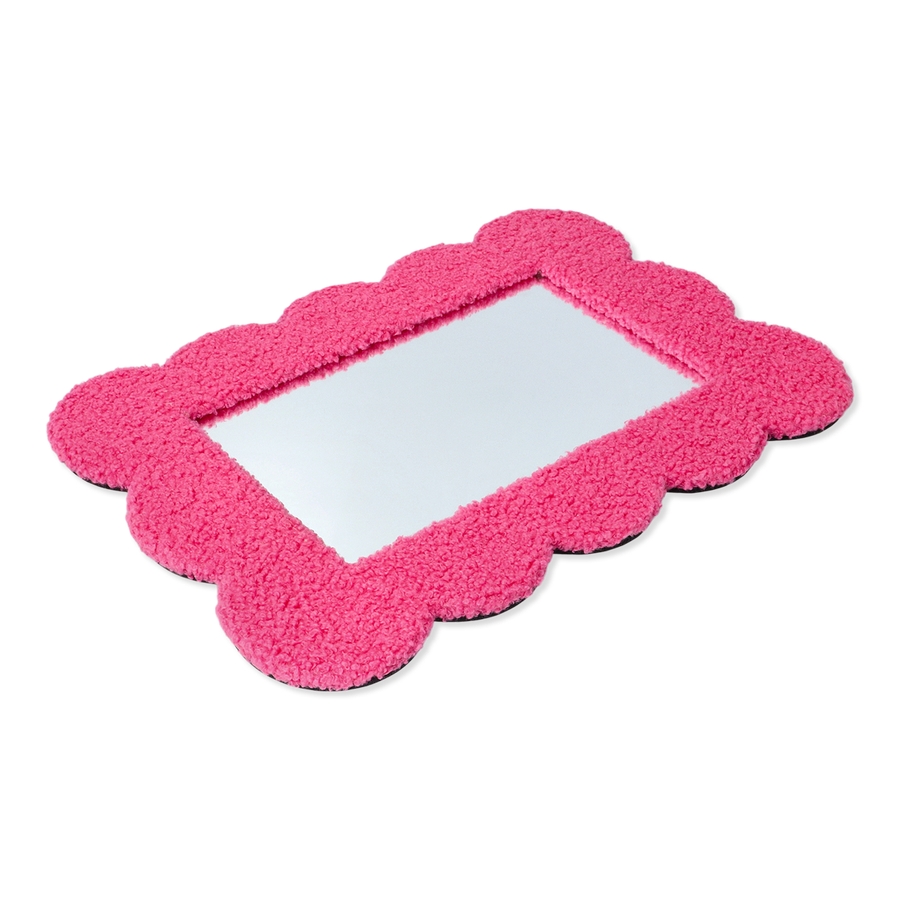 ピンクのデザインミラー。立て掛けても、壁に掛けてもお使いいただけます。モコモコのデコレーションで、インテリアのアクセントになります。マテリアルにリサイクル素材を使用している、エコフレンドリーなアイテムです。FSC認証。サイズ:35×25 cm。