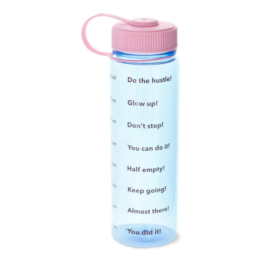 ドリンクボトル。朝から夜までの2時間ごとの目盛りに、モチベーションがアップするメッセージが添えられています。冷凍、食洗機対応です。容量:700ml。サイズ:22.5×7×7 cm。