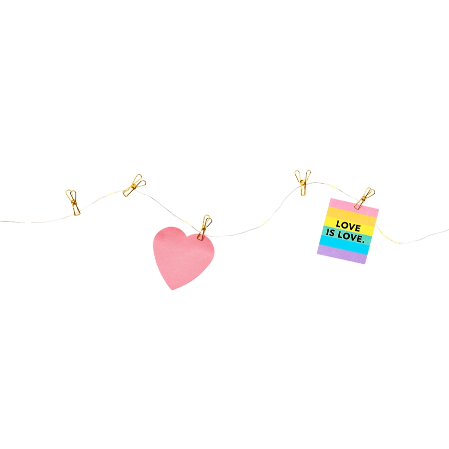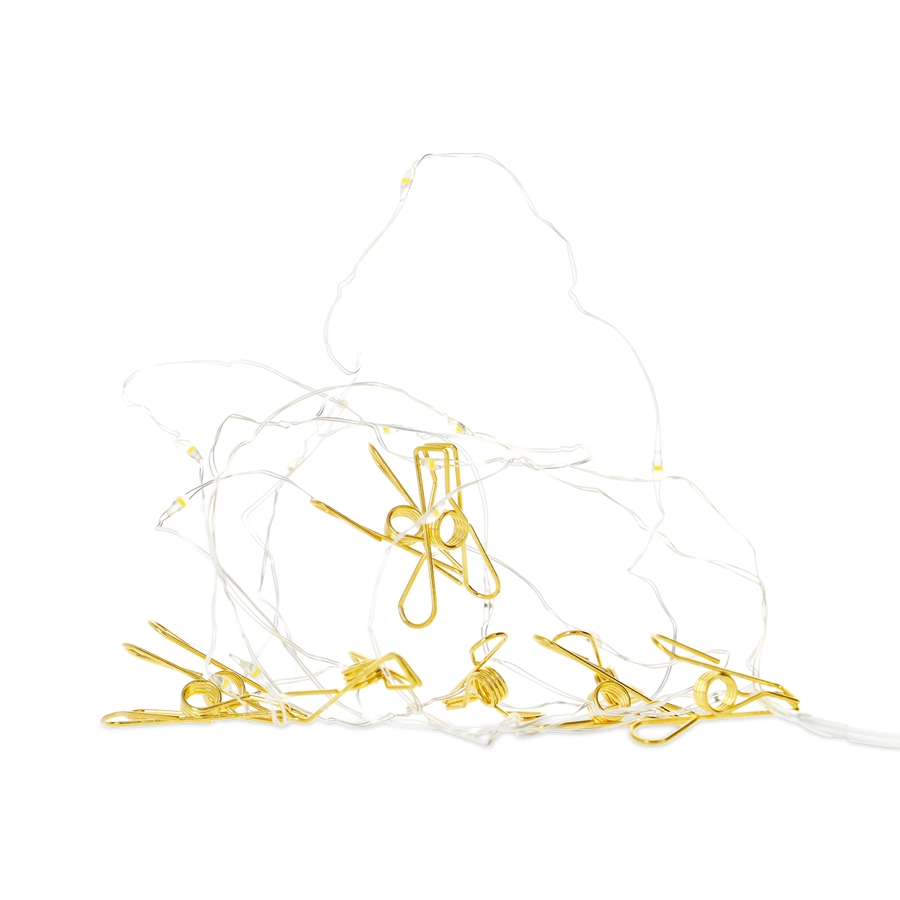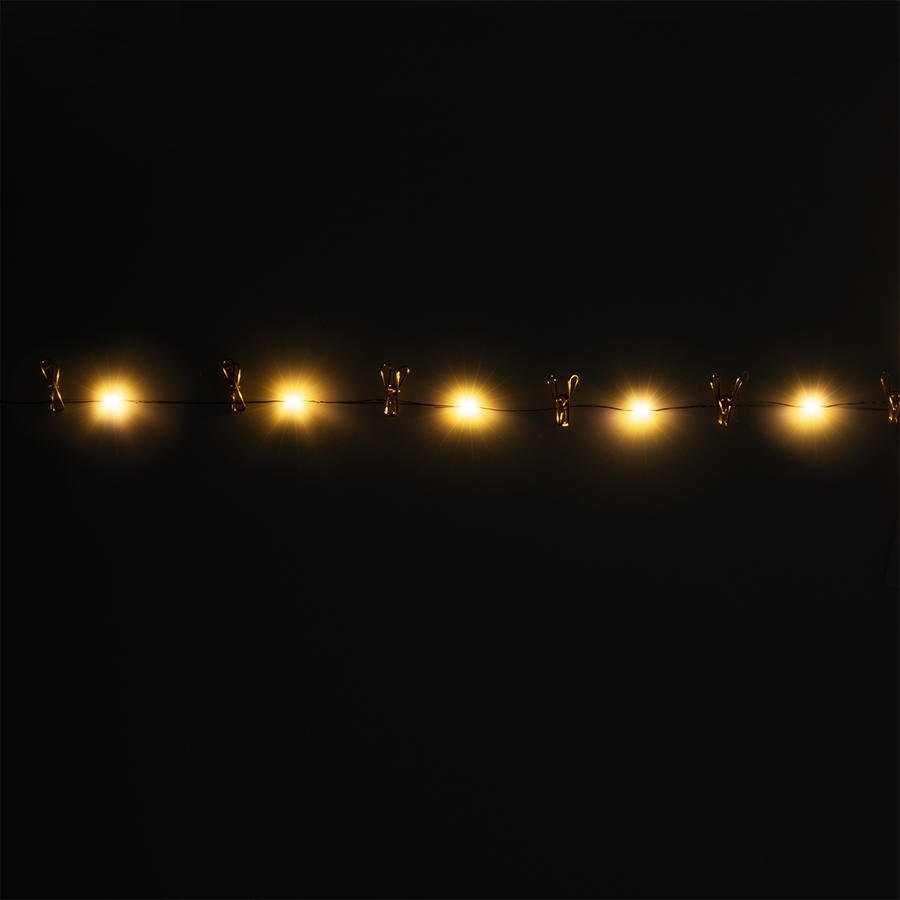 LEDストリングライト。LEDライト20個とゴールドのクリップ10個付きです。カードや写真を挟んで、オリジナルのライトチェーンを作りましょう。単三電池2本使用(別売)。長さ2.2mです。