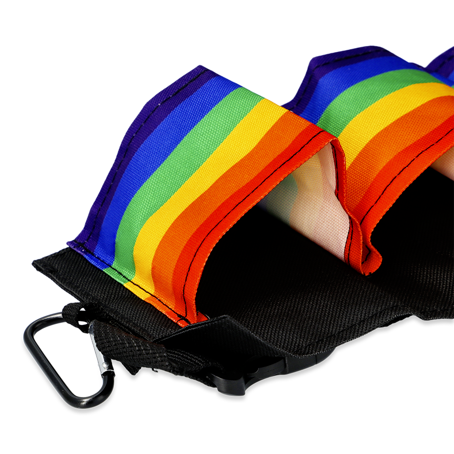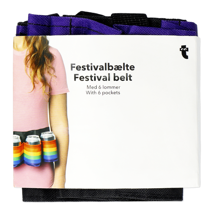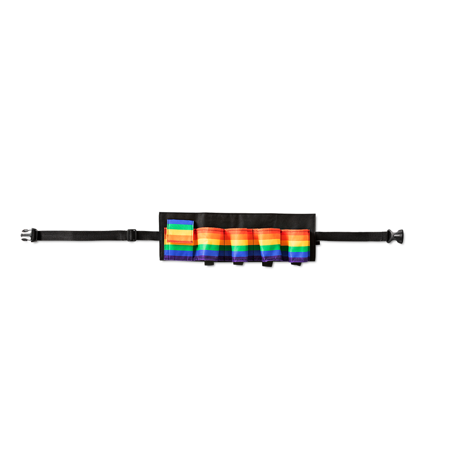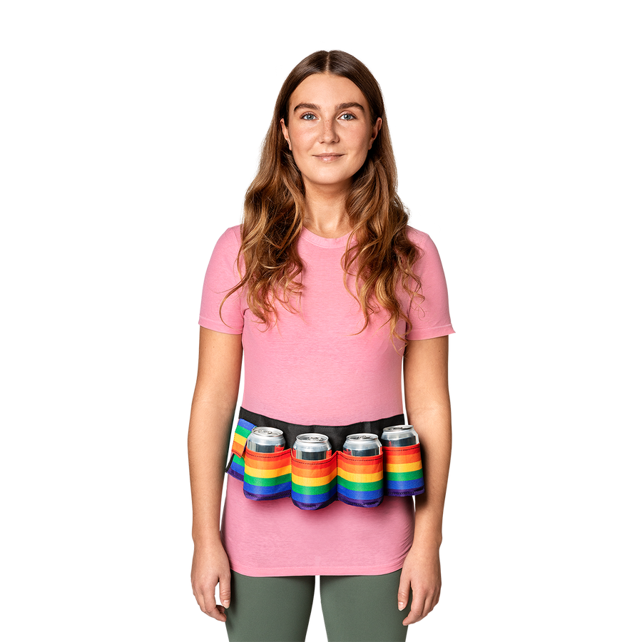 レインボーストライプが目を引くフェスティバル・ベルトで、スタイリッシュに出かけよう。ベルトにはドリンクホルダーが4つと、必需品を入れるポケットが2つ付いている。ポリエステル製で、53cmから78.5cmまで調節可能
