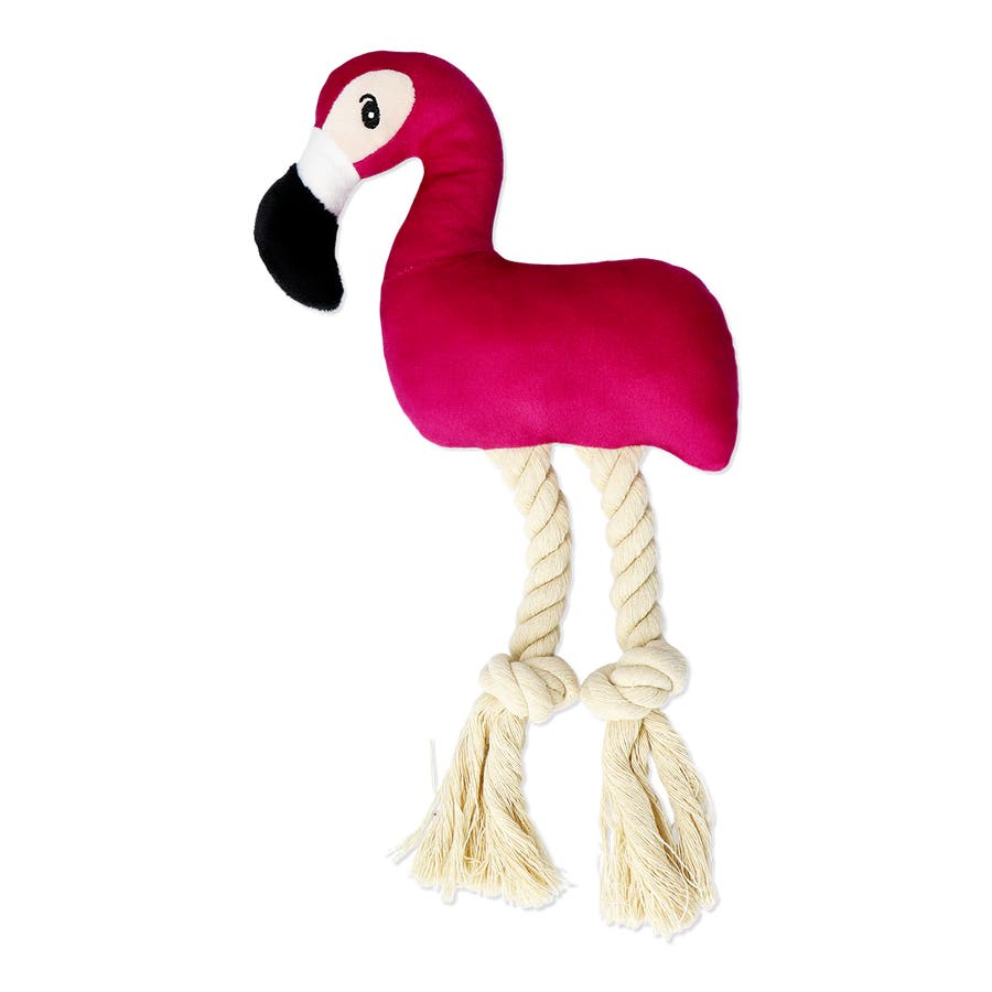 遊び心いっぱいのピンクのフラミンゴは、17×20×4cmの大きさで、楽しさと機能性を兼ね備えています。引っ張れる丈夫なロープと抱っこできる柔らかいボディが特徴で、ふれあい遊びにも一人遊びにも最適です