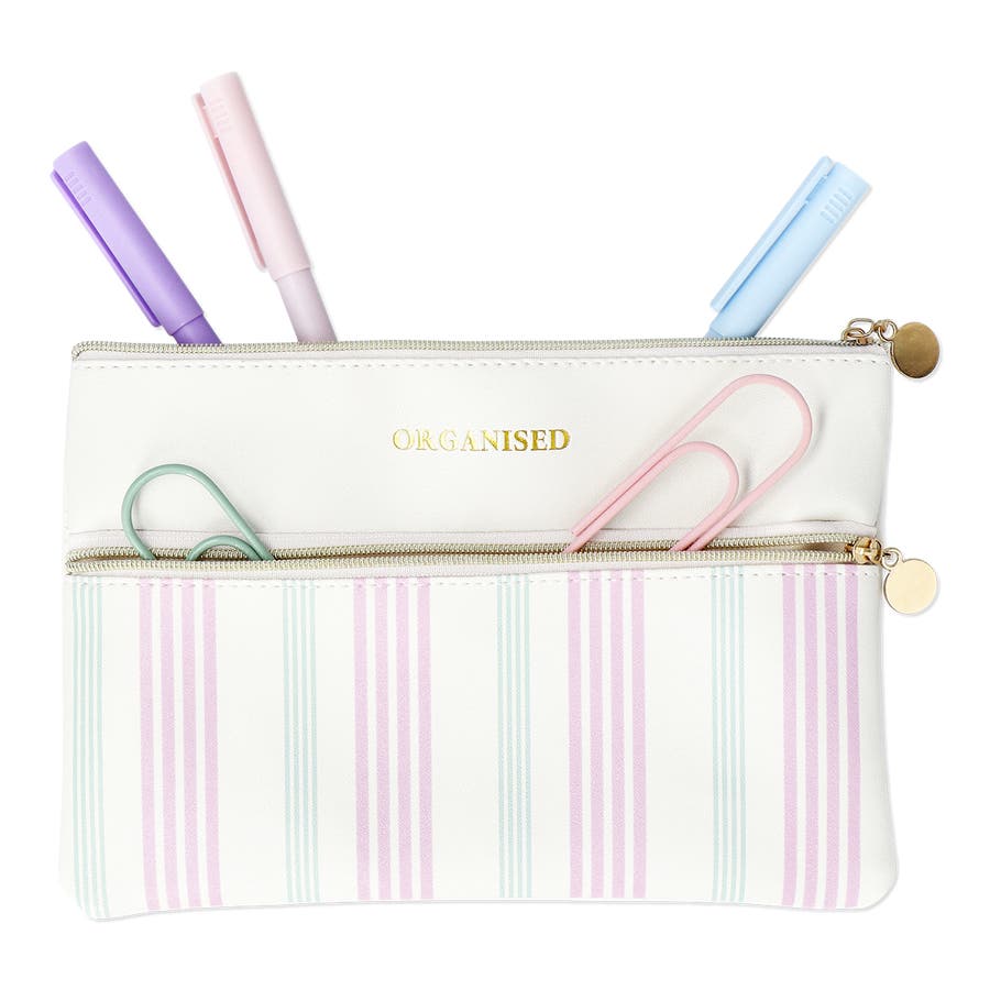 ペンや鉛筆をすっきりと収納できる、エレガンスと機能性を兼ね備えた魅力的なペンケース。落ち着いた色調のスタイリッシュなストライプ柄で、15×21×1cmとバッグやデスクの引き出しに入れるのにぴったりのサイズです。ゴールドのレタリングが気品を添え、実用的なアイテムとしてだけでなく、ワークスペースの必需品をシックなアクセサリーにしてくれます。
