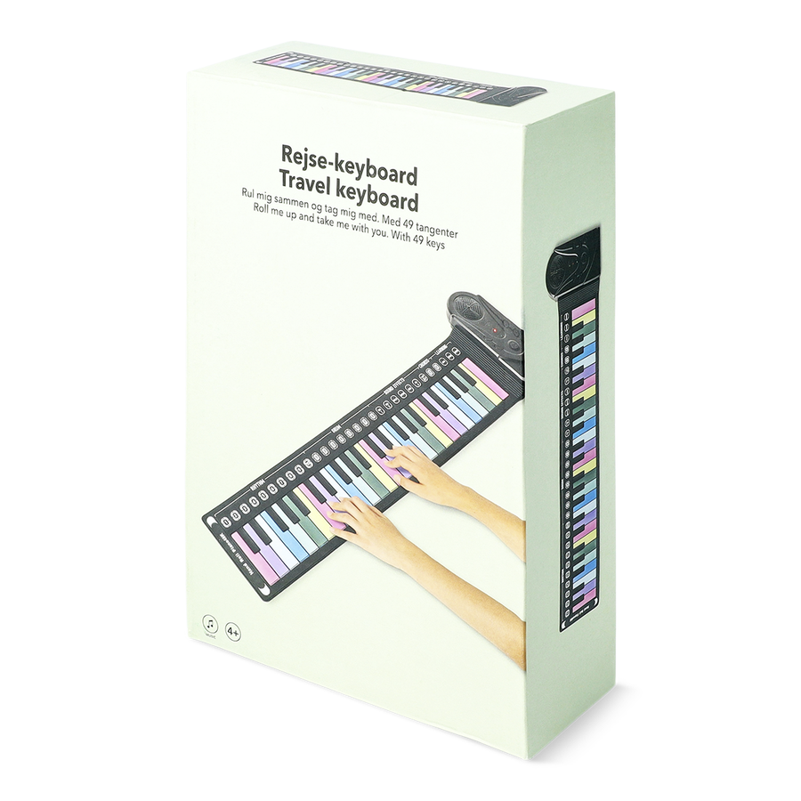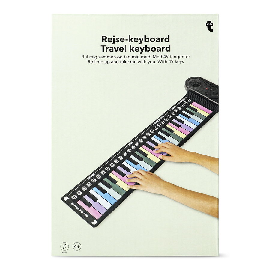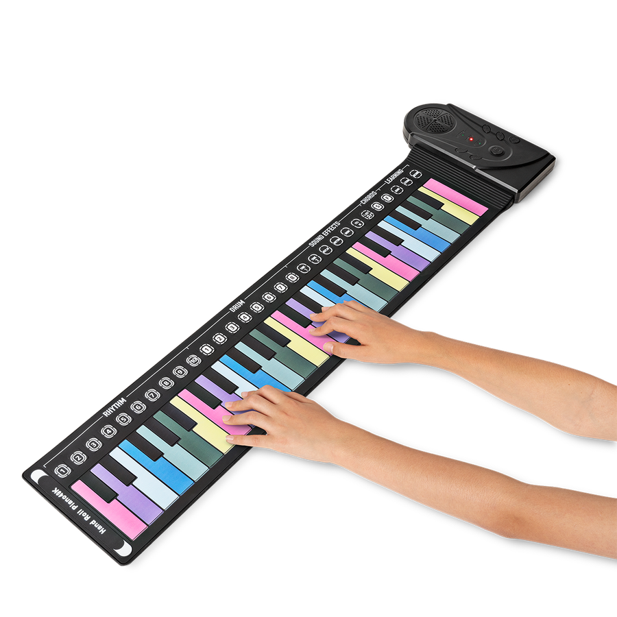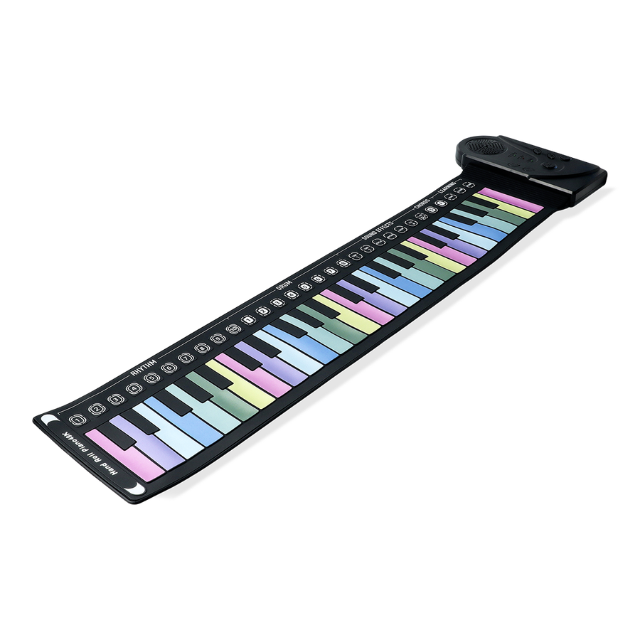 カラフルなロールアップピアノ。プラスチック製のこのポータブルピアノのサイズは83.4 x 22.4 cm。鮮やかなマルチカラーの鍵盤が特徴で、楽器の音色や、名曲を録音できる録音機能も付いています。また、個人練習用にジャックプラグ付きのヘッドセットを追加することもできます。旅行に最適なこのピアノは、簡単に丸めて収納でき、持ち運びにも便利です。電源は単4形乾電池3本(別売)で、自宅でも外出先でも、何時間でも音楽を楽しめます。