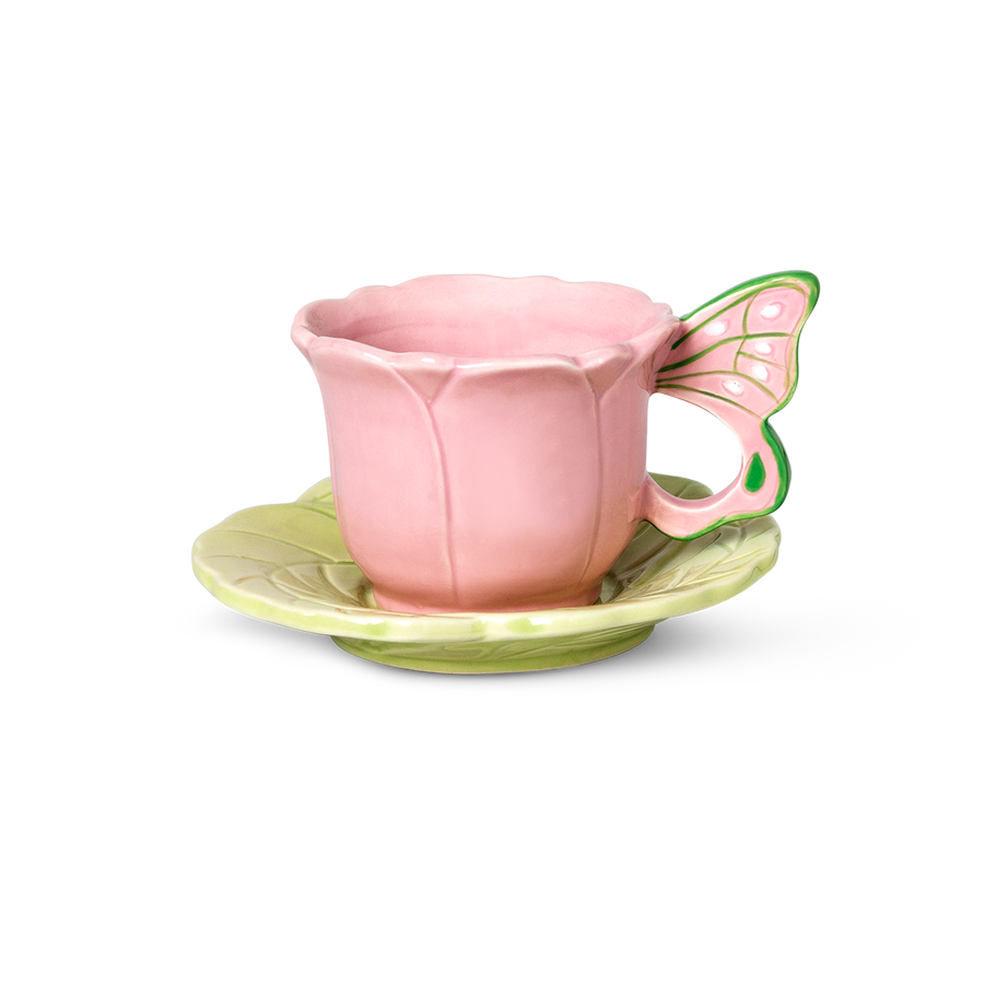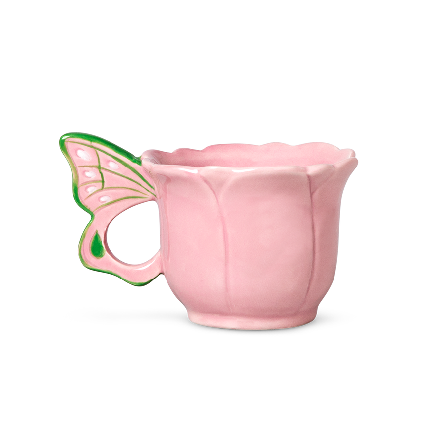 この気まぐれな蝶のマグカップとお揃いのソーサーで、春の美しさを楽しみましょう。陶器製のマグカップは、蝶の形をした持ち手がチャーミングで、ドリンクウェアコレクションに遊び心をプラスします。繊細な葉っぱの形をしたソーサーは、花にインスパイアされたデザインを完璧に引き立てます。容量110ml、12.1×7.1×8.9cmのこのマグカップは、朝のエスプレッソや午後のティータイムを楽しむのに最適です。柔らかなピンクの色調とマルチカラーのディテールが、咲き誇る花々のフレッシュで生き生きとした精神を呼び起こします。食卓に春らしさを添える、食器としてもお使いいただけるマグ&ソーサーセットです。