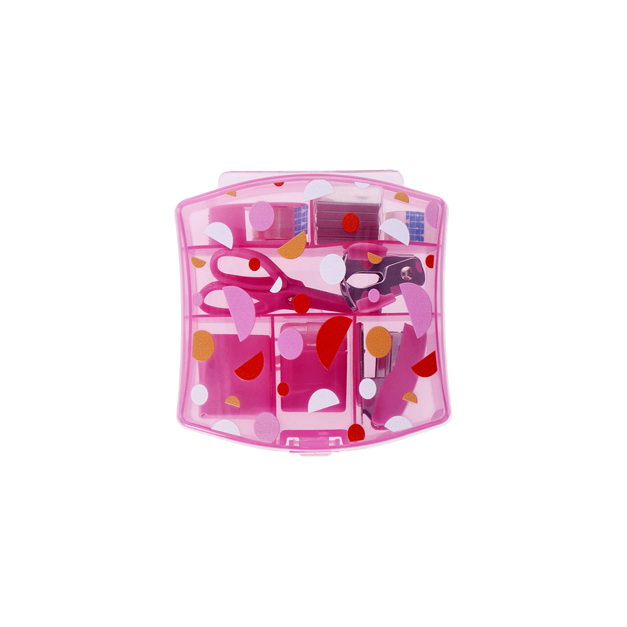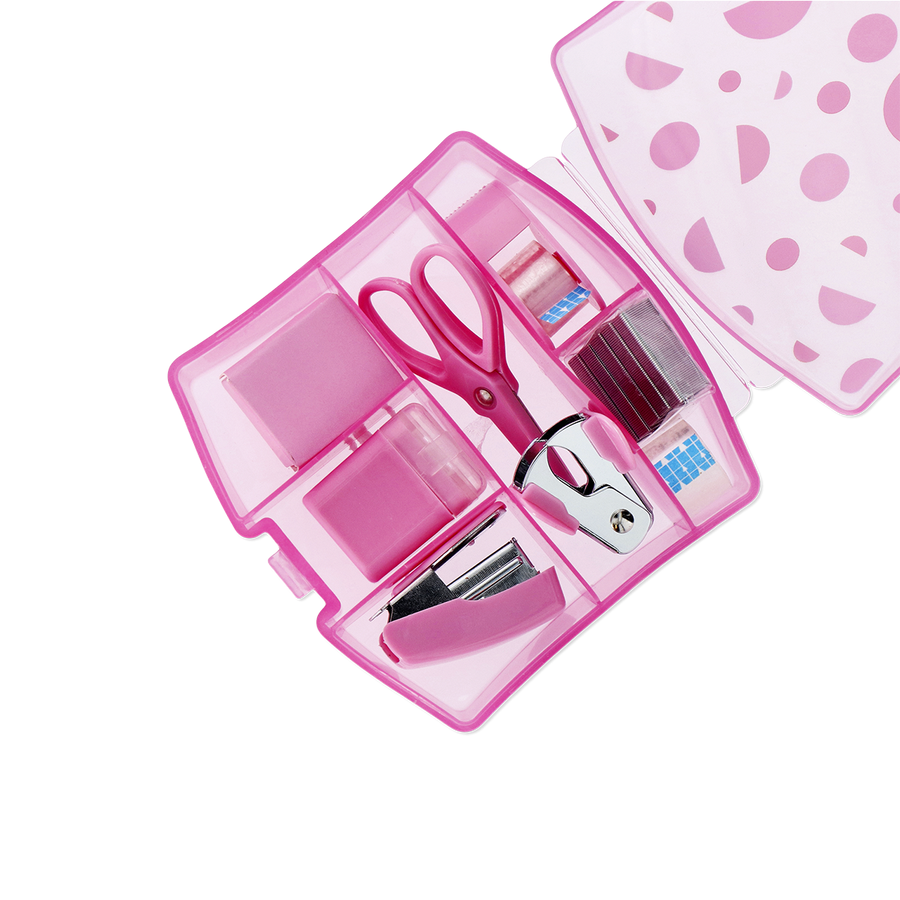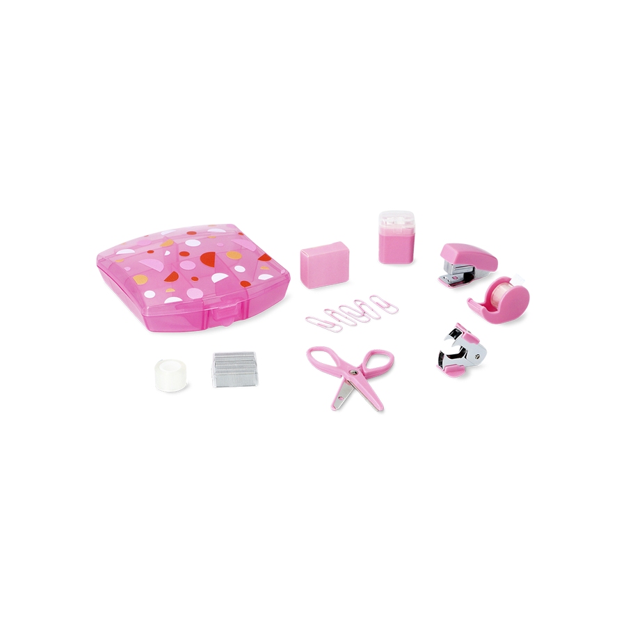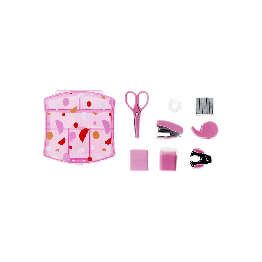 学校、オフィス、家庭での使用に最適な、コンパクトなピンクのステーショナリーセットで整理整頓を。 10.5 x 10.7 x 3 cmのこのプラスチックキットには、はさみ、テープ、ホッチキス、付箋など、オフィスに欠かせない必需品が便利なケースにきちんと収納されています。 持ち運びに便利なデザインで、バッグやデスクの引き出しに収まるので、毎日の必需品をすぐに取り出せる理想的なキットです。 鮮やかなピンクのデザインは、ワークスペースに楽しいタッチを加えながら、すべてを整頓して手の届くところに置いておけます。 仕事でも、勉強でも、クリエイティブなプロジェクトでも、このステーショナリーキッセットはタスクを整理整頓するための必需品です。