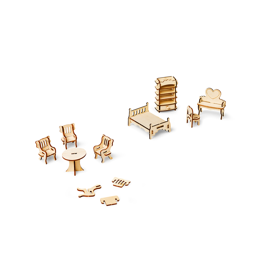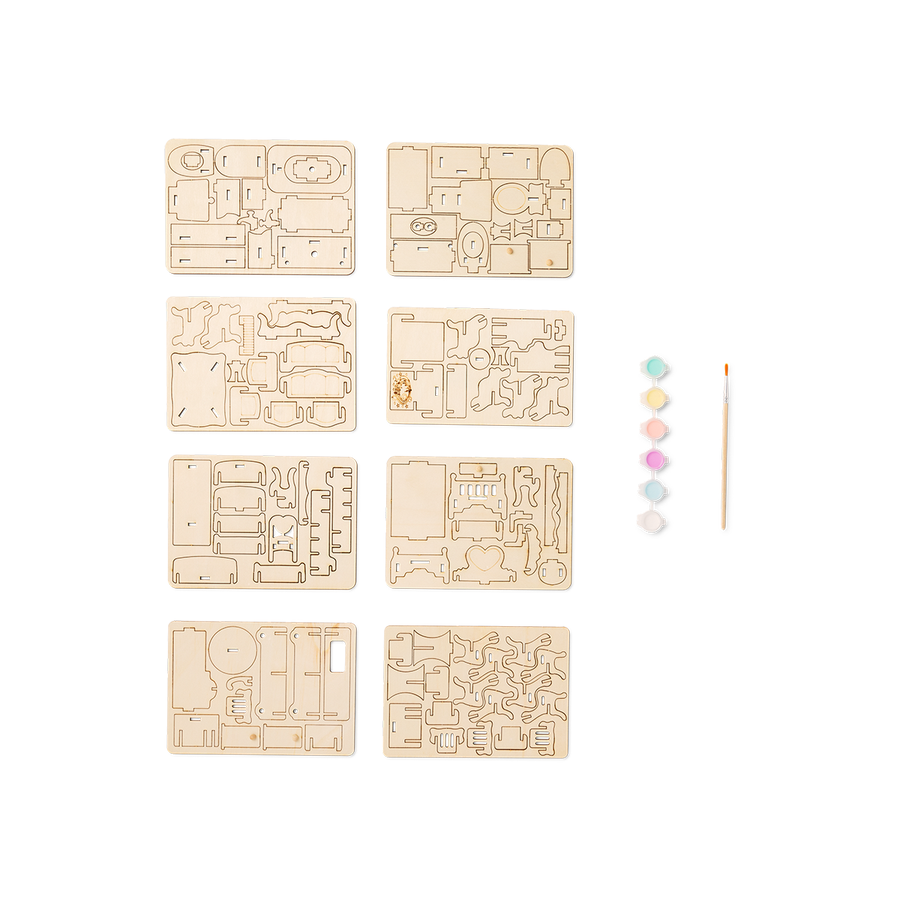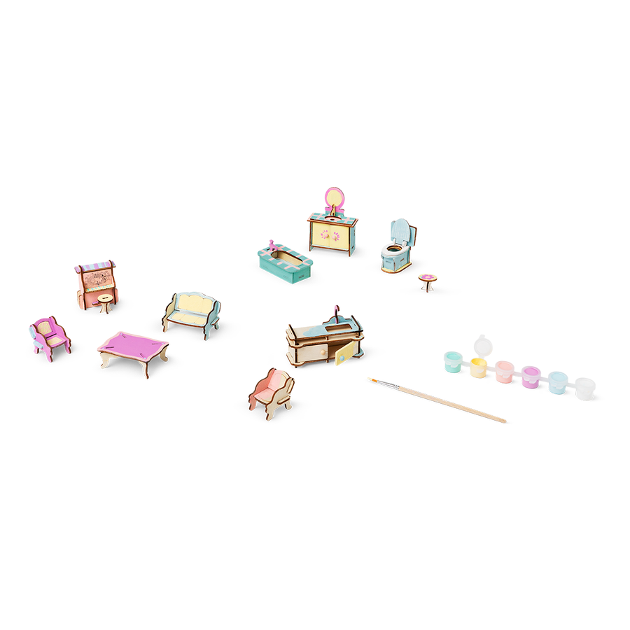 DIYミニチュア家具で、自分だけのミニチュアの世界を作り、飾り付けましょう。木製パーツと絵具と筆がセットになったこのキットなら、細部まで自由に組み立ててカスタマイズできます。クラシックな椅子や快適なベッドから、化粧台や調理用コンロまで、それぞれのパーツを簡単に組み合わせて、ミニチュアハウスの家具一式を作り上げることができます。このプロジェクトは、創造性と実践的な楽しさを兼ね備えており、何時間でも夢中になれるアクティビティです。ドールハウス愛好家や、細かい作業が好きな方にとって最適です。想像力を形にし、小さな家のシーンを自分らしく彩る素敵な方法です。