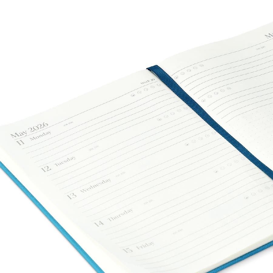 ティール色の2026年用WEEKLY手帳で、1週間を整理しましょう。B6 13x18x1cm、英語版。爽やかなブルーの表紙と、プラスチック製の洗練されたフェイクレザーの質感が特徴のこのカレンダーは、計画性を高めるためにデザインされています。実用的な週間レイアウトで、年間を通して予定、締め切り、メモなどを整理するのに役立ちます。目立たない留め具でページを閉じられるので、バッグや引き出しの中でもすっきりと保ちます。表紙にはスタイリッシュなプリントで「2026」が描かれ、洗練されたデザインにアクセントを加えています。学校、仕事、プライベートのスケジュール管理など、どんな用途にも使えるこのWEEKLY手帳は、年間を通して大切なことをすべて記録するための、機能的でありながら洗練されたソリューションを提供します。