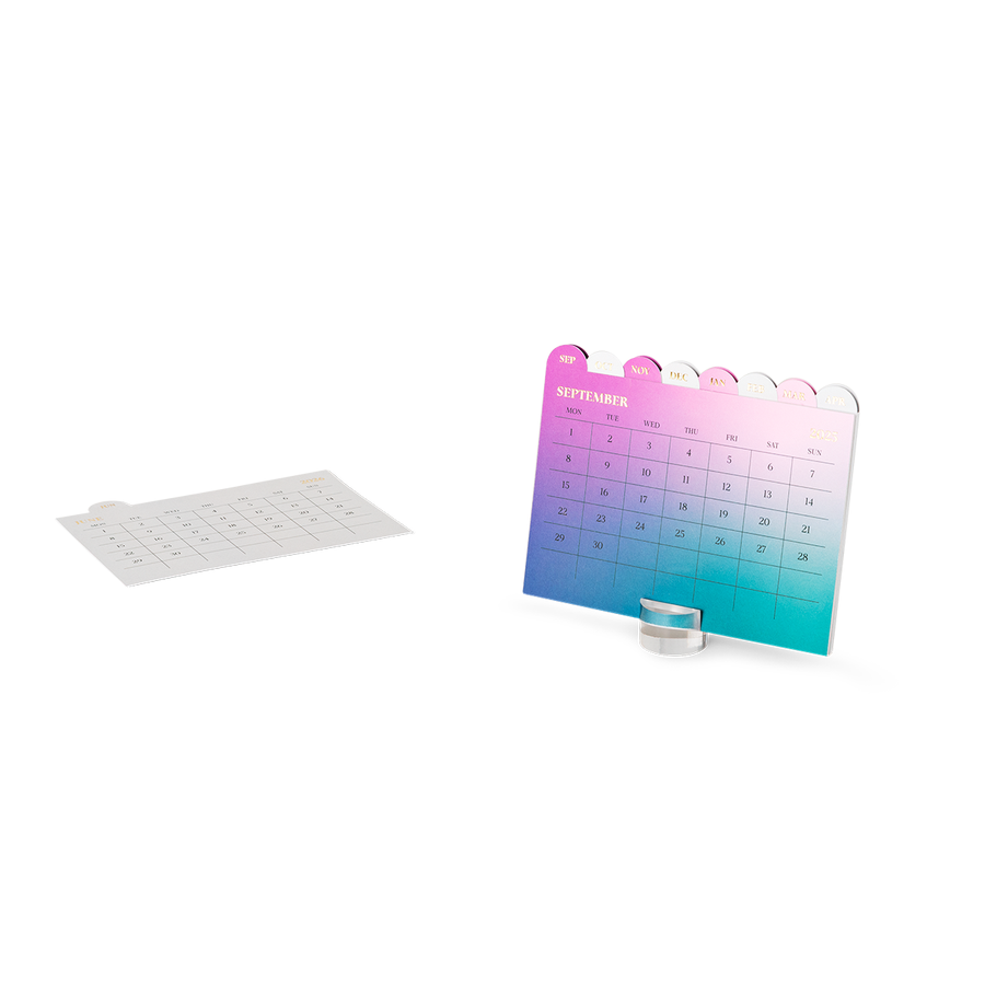2025年9月から2026年までをカバーする英語版のコンパクトな卓上カレンダーで、ワークスペースに彩りを添えましょう。柔らかなマルチトーンのグラデーション背景でデザインされたこのカレンダーは、学年度や事業年度を通して予定をスタイリッシュかつ実用的に管理できます。上部のタブで月と月の切り替えが簡単にでき、一目で毎日の予定がわかるレイアウトになっています。学習、会議、日常業務の計画に最適で、卓上の必需品です。どんなデスクにもすっきり収まるスリムなフォルムで、機能性とセンスの両方を兼ね備えています。