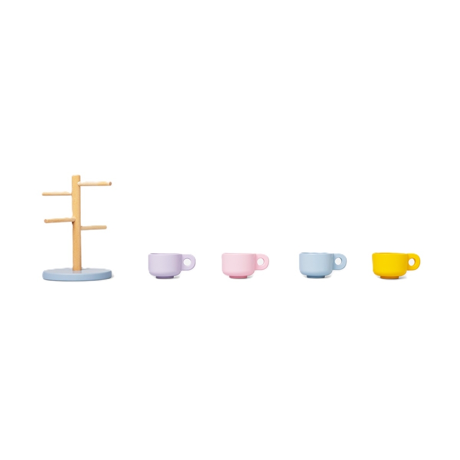 ホルダー付きの木製おもちゃのカップのセットで、遊びの時間を楽しく演出しましょう。