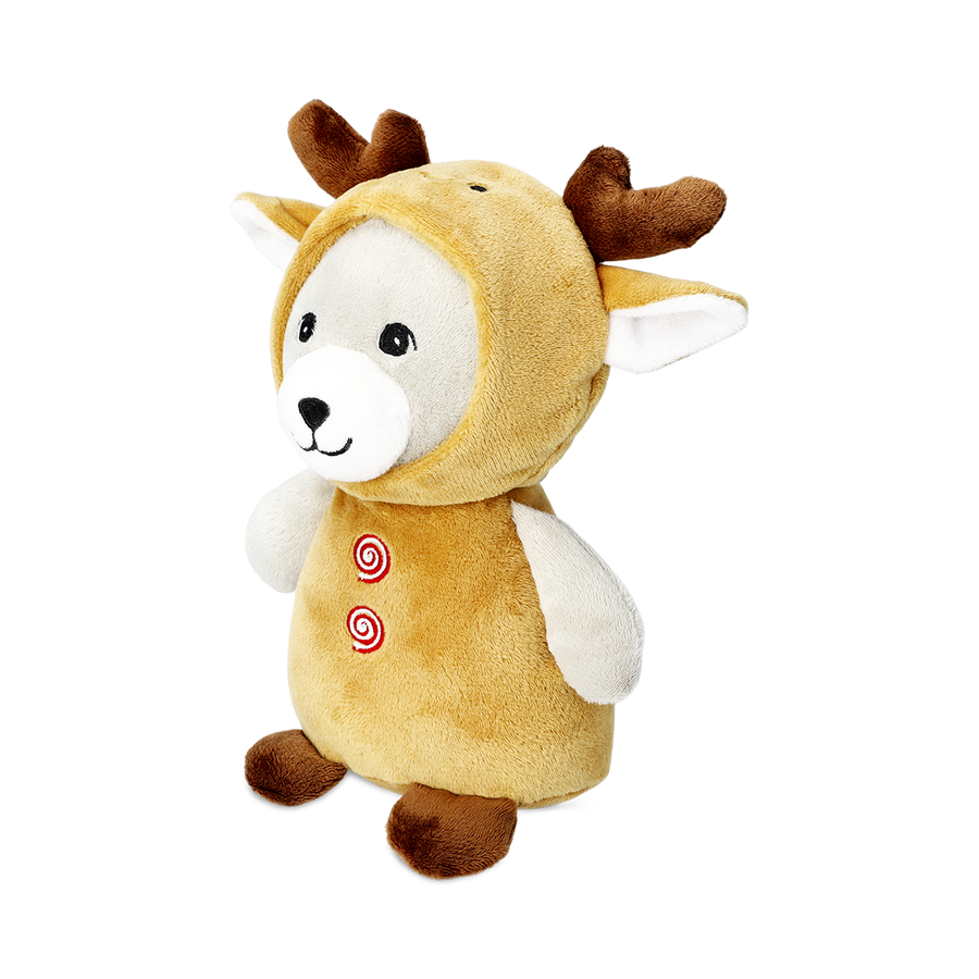トナカイの角と刺繍のボタンをあしらった、愛らしいトナカイのぬいぐるみで、クリスマスシーズンに華やかな雰囲気を添えましょう。