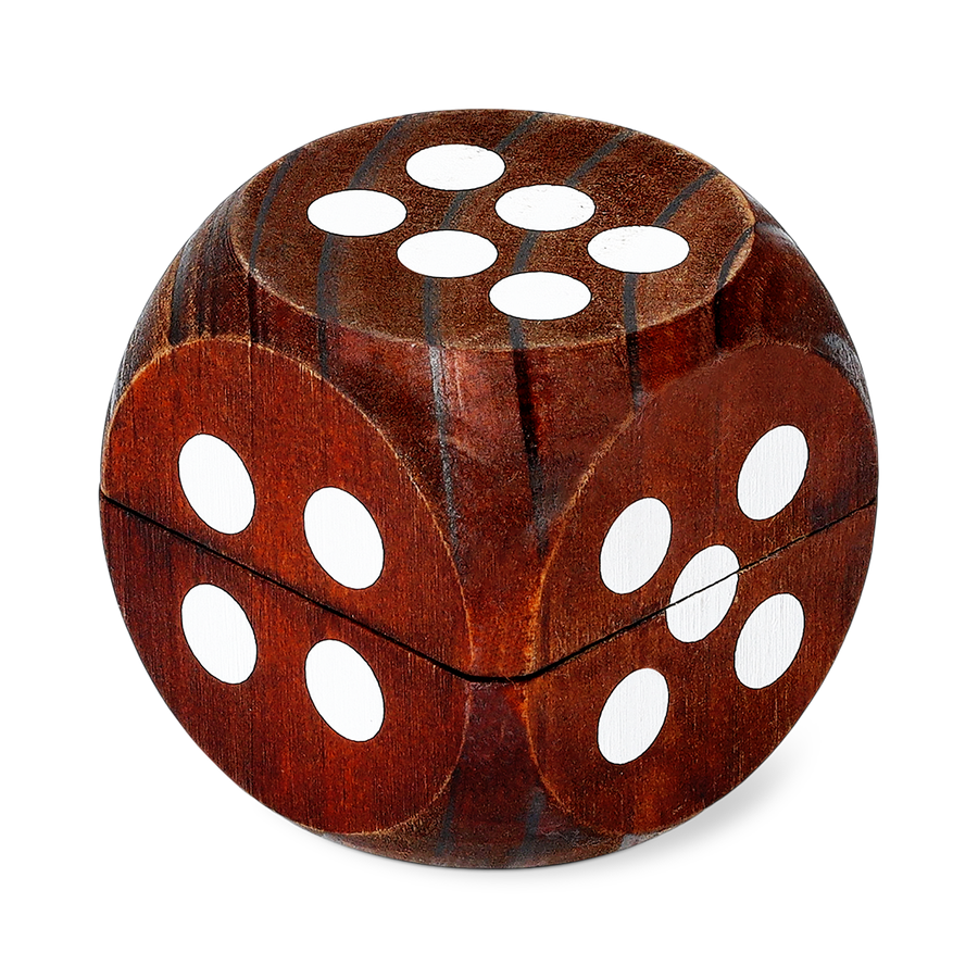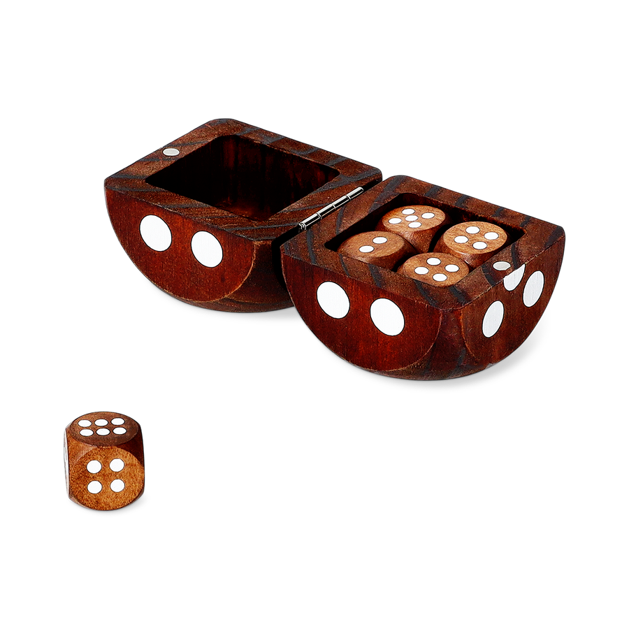 ブラウンの木材にドットを施したセットには、5個のダイスと、装飾品としても使えるヒンジ付き収納ボックスが付属しています。