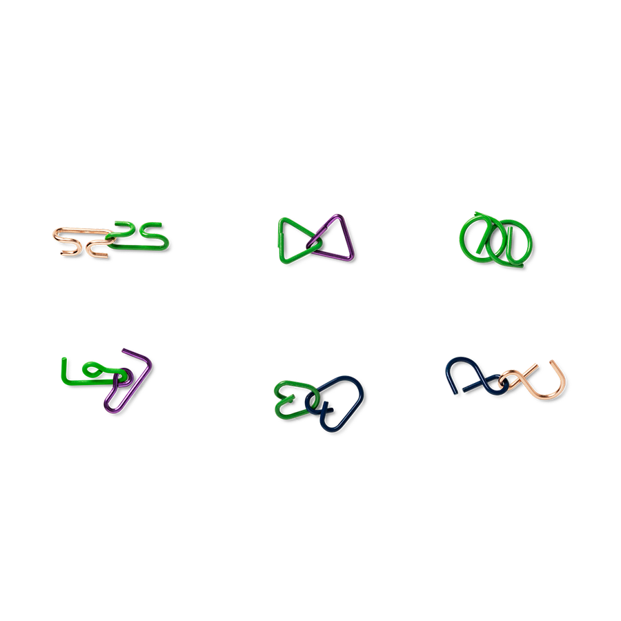 各パズルはカラフルな金属で作られており、ひねったり回したりして論理的に考えさせられるように設計されています。