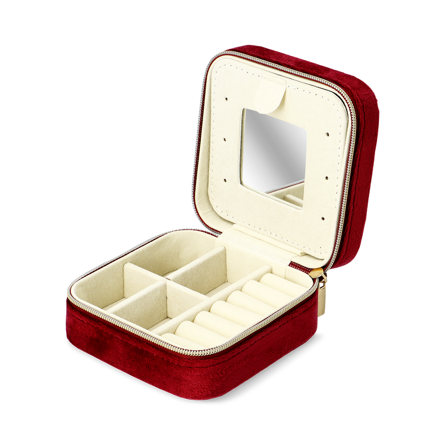 プラム色のベルベットのジュエリーボックスで、大切なアクセサリーをすっきりと収納しましょう。ご自宅でも旅行でも、どんなシーンでも活躍する、細部までこだわったデザインです。リング、イヤリング、小さな思い出の品などを収納できる複数のコンパートメントに加え、蓋の内側には鏡が付いているので、さっと確認、お直しもできます。柔らかなベルベット仕上げが上品な印象を与え、ジッパー開閉で中身をしっかり守ります。サイズは4.8 x 10.2 x 9.9cmで、引き出しやハンドバッグ、スーツケースにすっきり収まります。毎日のお手入れや、心のこもったギフトにも最適な、コンパクトなこのボックスは、美容とジュエリーの収納をスタイリッシュに、そして機能美を兼ね備えたソリューションを提供します。