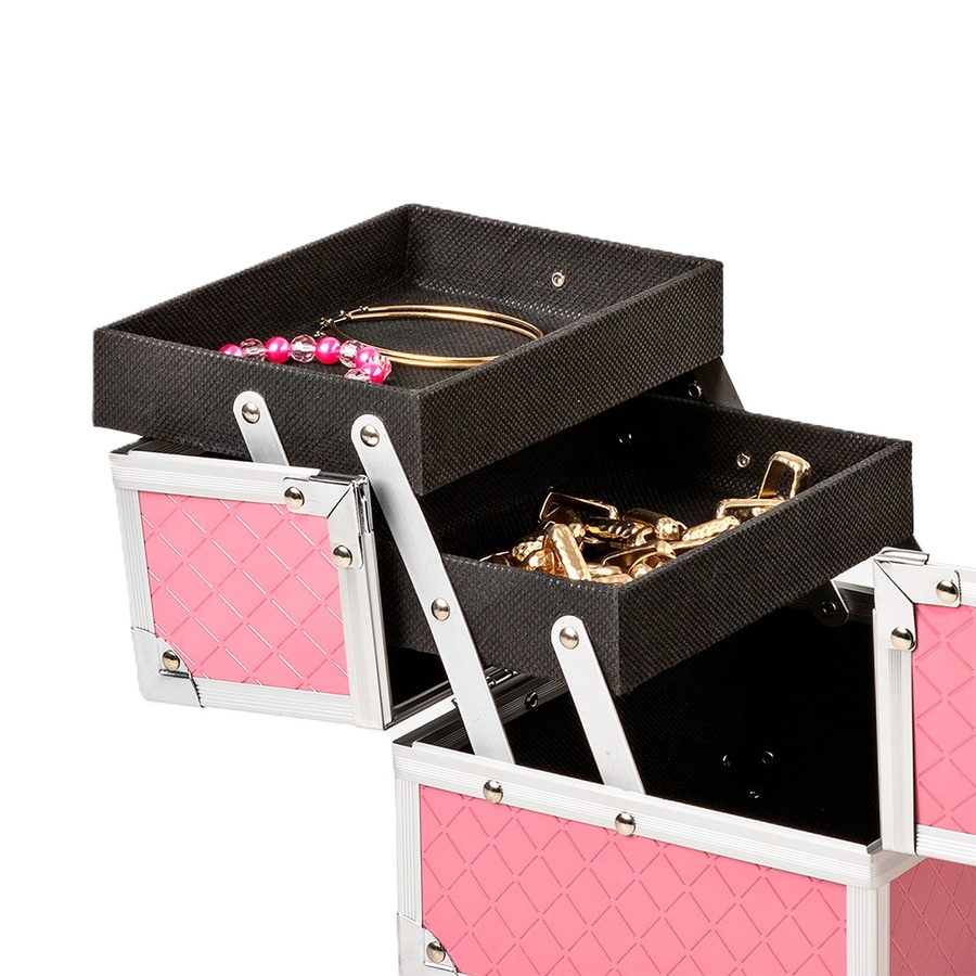 スタイリッシュなキルティング仕上げと便利なラダースタイルの収納部を備えた、ピンクのメイクボックスで、化粧品をすっきりと整理し、取り出しやすく収納できます。
