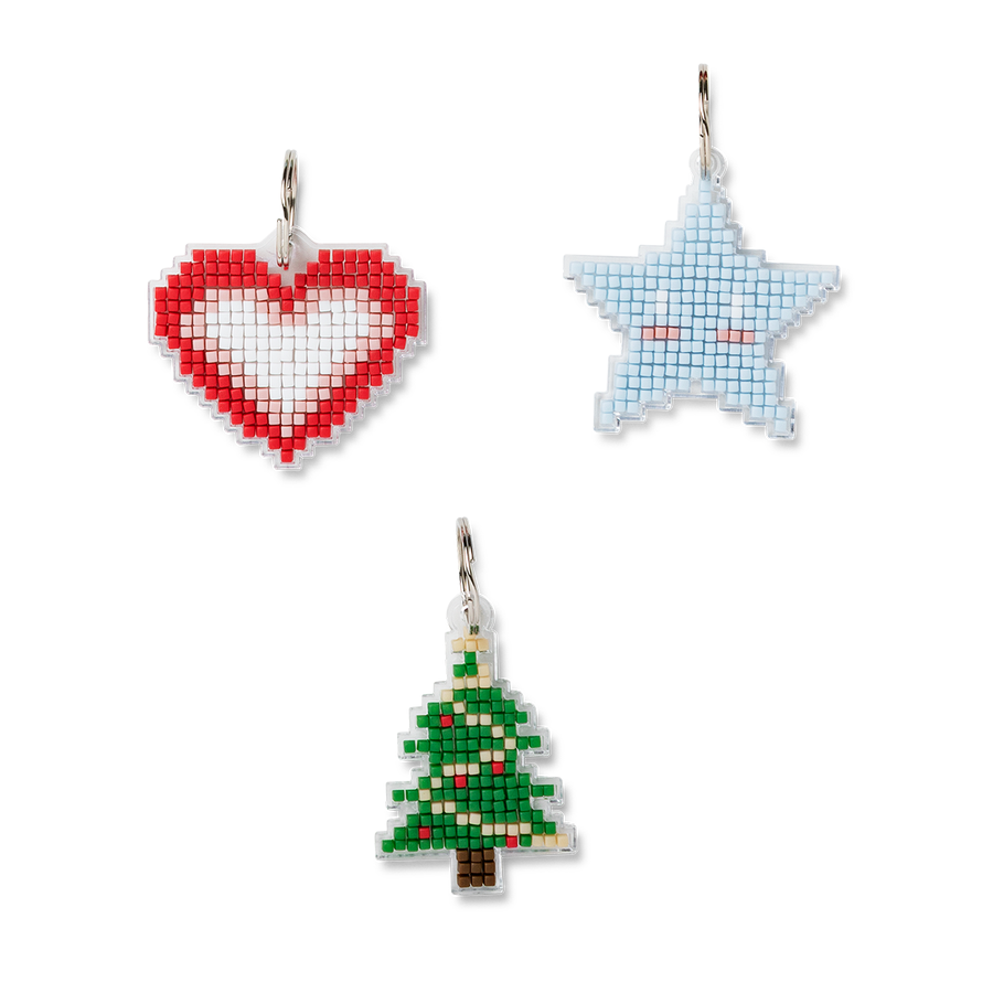 キットには星、ツリー、ハートなどのビーズの型紙が含まれており、どれも楽しいピクセル風デザインです。