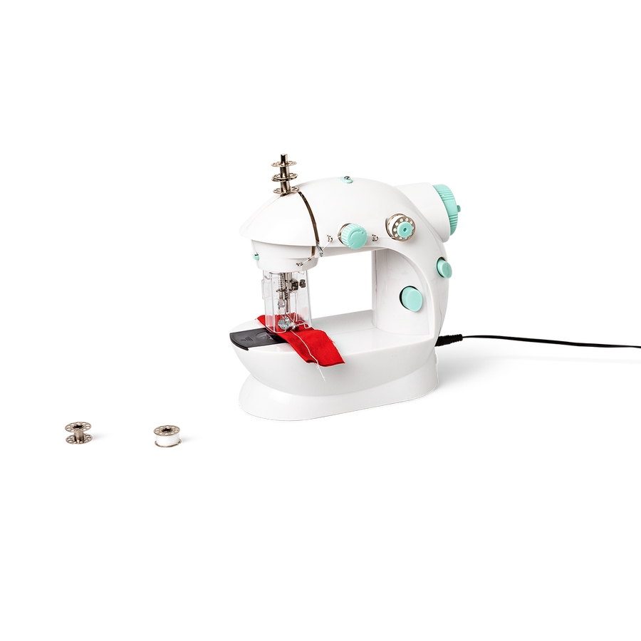 小さなお子さまの手にぴったりの、カラフルなミシンです。9.5×20×18.5cmのサイズで、糸2巻と布が付属しているので、すぐに始めることができます。