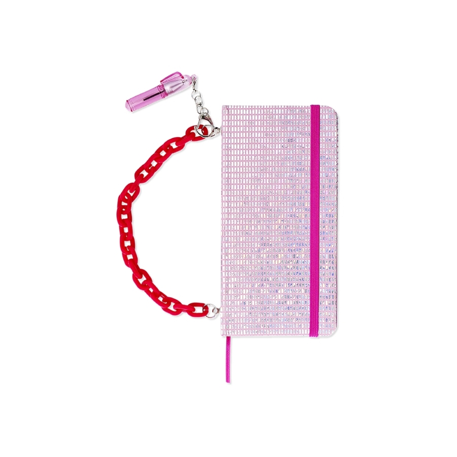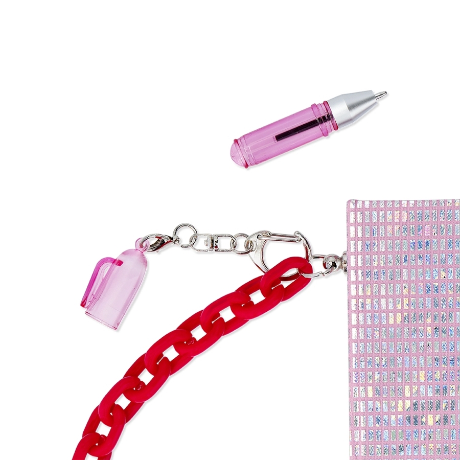 目を引くマルチカラーの仕上げ、チェーンスタイルのハンドル、そして遊び心のあるチャームのディテールが、まるで小さなアクセサリーのようです。
