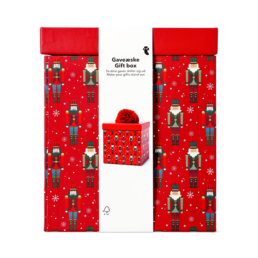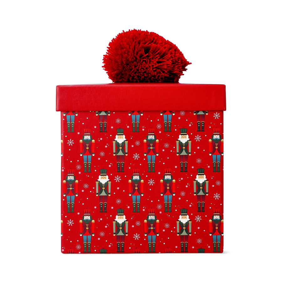 楽しいくるみ割り人形のモチーフがあしらわれた、ダークレッドのギフトボックスで、ホリデーシーズンのラッピングに華やかさを添えましょう。
