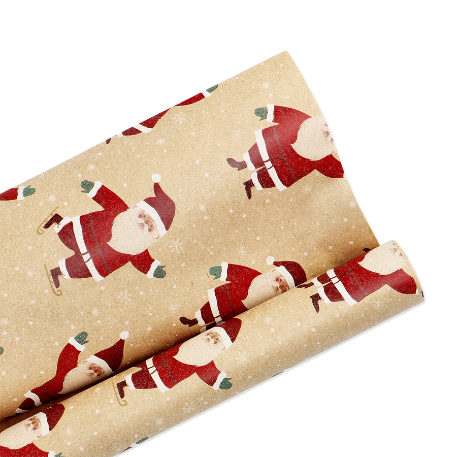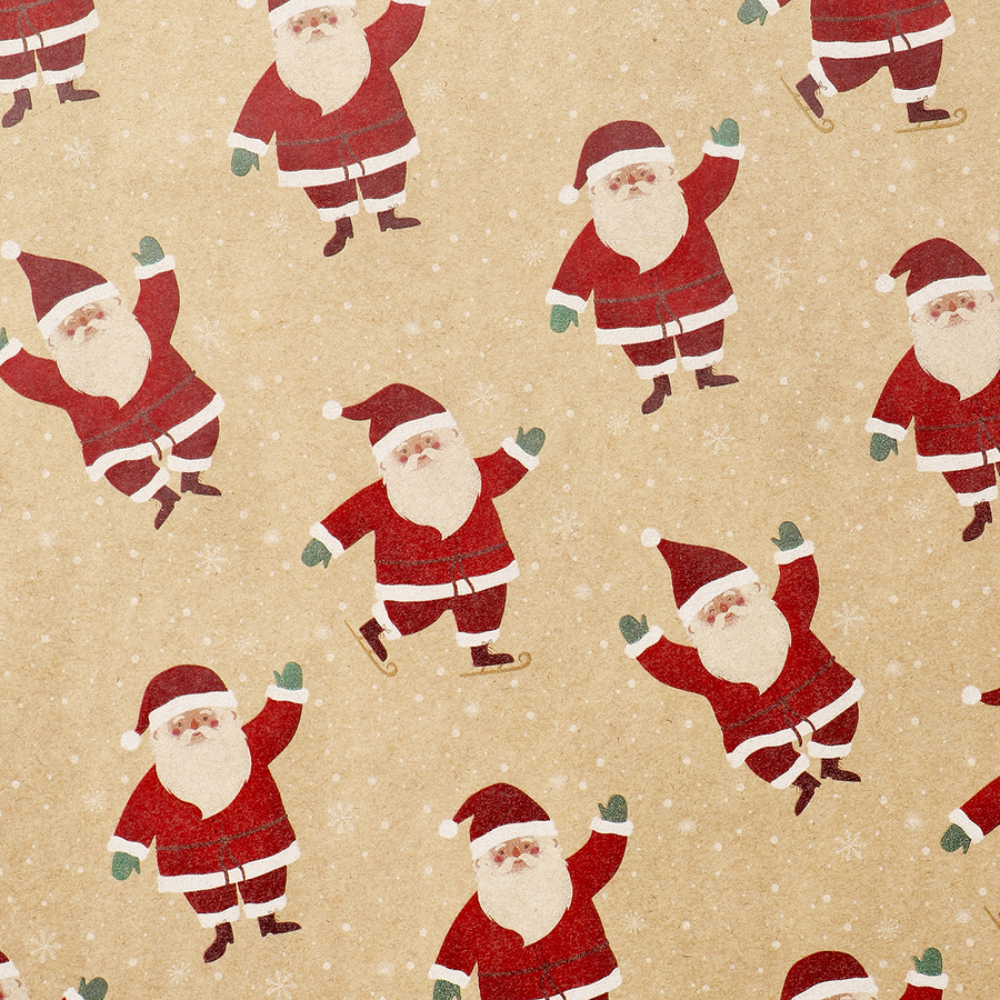 飛んでいるサンタ柄のクラフト包装紙で、クリスマスギフトに楽しいひねりを。