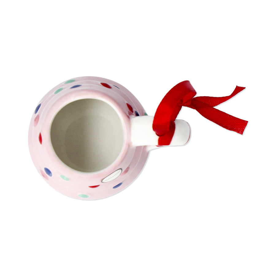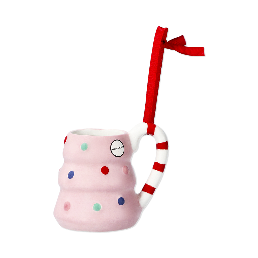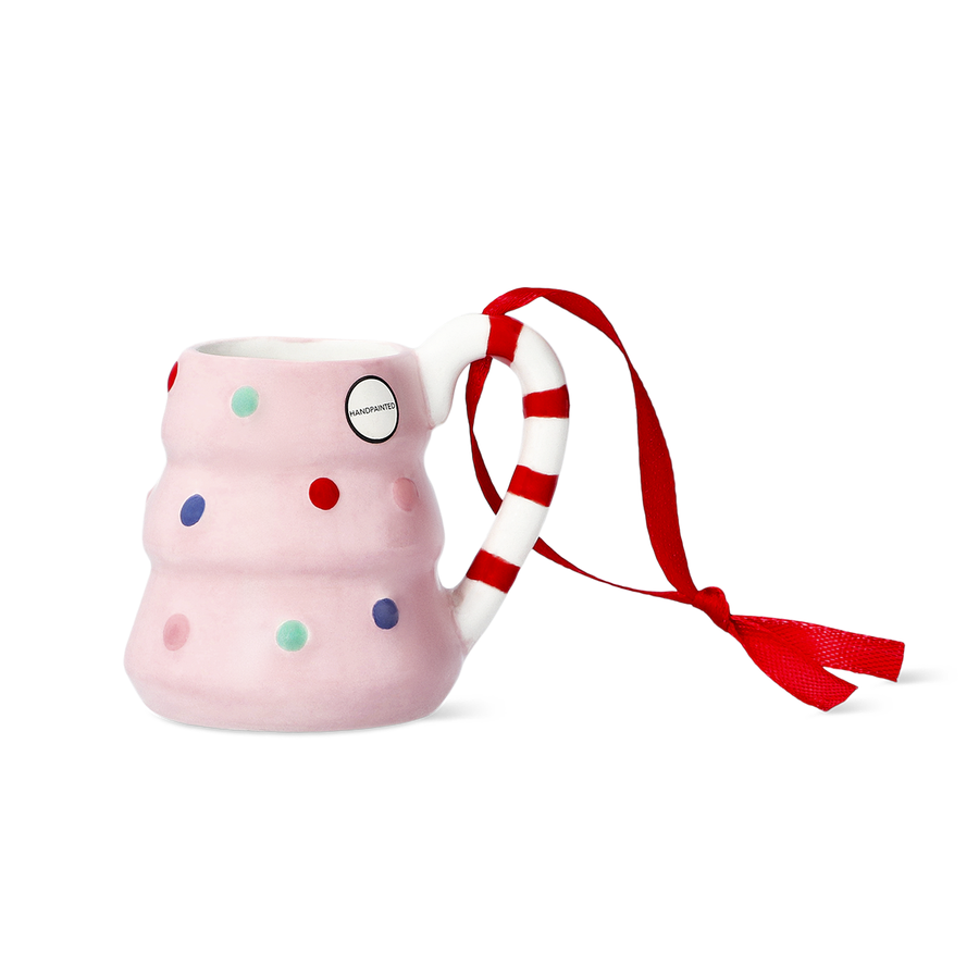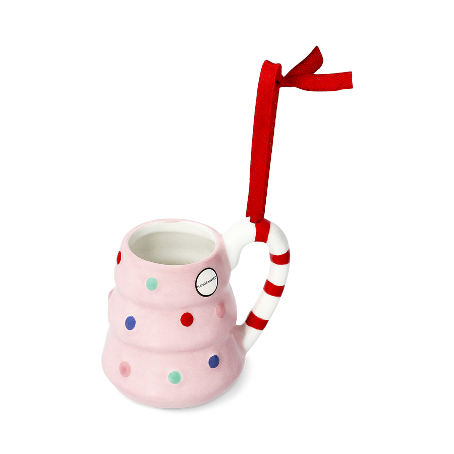 ミニ・ピンククリスマスツリーのマグオーナメントで、デコレーションに遊び心を。カラフルなドット柄とストライプのハンドルが、季節の明るいムードをコンパクトに表現します。赤いリボンループでツリーやお部屋の好きな場所に簡単に吊るせます。セラミック製、5.2×6.2×6.5cm。ディスプレイの差し色や、ギフトのワンポイントにぴったりの愛らしいオーナメントです。